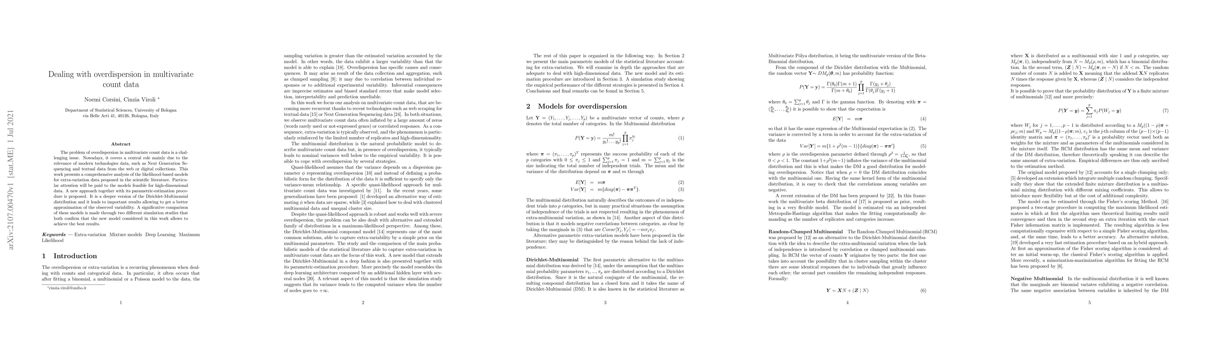 The problem of overdispersion in multivariate count data is a challenging issue. Nowadays, it covers a central role mainly due to the relevance of modern technologies data, such as Next Generation Sequencing and textual data from the web or digital collections. This work presents a comprehensive analysis of the likelihood-based models for extra-variation data proposed in the scientific literature. Particular attention will be paid to the models feasible for high-dimensional data. A new approach together with its parametric-estimation procedure is proposed. It is a deeper version of the Dirichlet-Multinomial distribution and it leads to important results allowing to get a better approximation of the observed variability. A significative comparison of these models is made through two different simulation studies that both confirm that the new model considered in this work allows to achieve the best results.