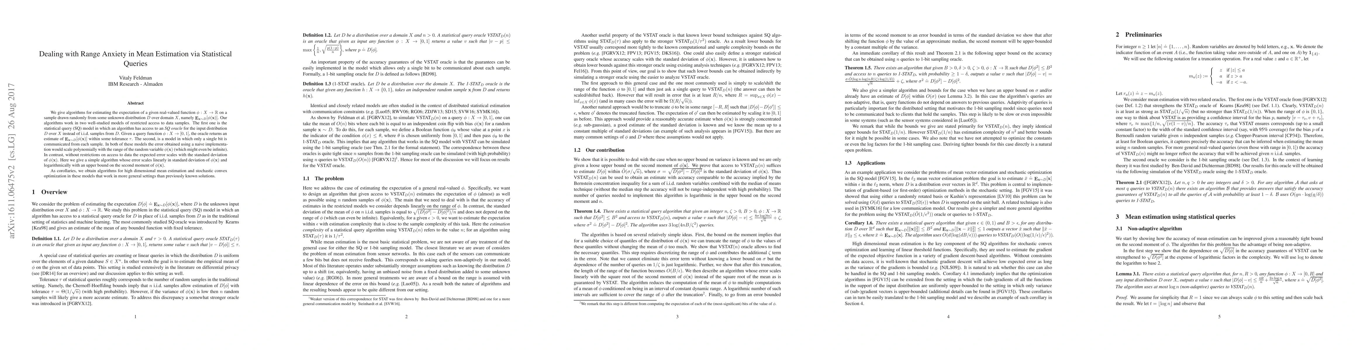 We give algorithms for estimating the expectation of a given real-valued function $\phi:X\to {\bf R}$ on a sample drawn randomly from some unknown distribution $D$ over domain $X$, namely ${\bf E}_{{\bf x}\sim D}[\phi({\bf x})]$. Our algorithms work in two well-studied models of restricted access to data samples. The first one is the statistical query (SQ) model in which an algorithm has access to an SQ oracle for the input distribution $D$ over $X$ instead of i.i.d. samples from $D$. Given a query function $\phi:X \to [0,1]$, the oracle returns an estimate of ${\bf E}_{{\bf x}\sim D}[\phi({\bf x})]$ within some tolerance $\tau$. The second, is a model in which only a single bit is communicated from each sample. In both of these models the error obtained using a naive implementation would scale polynomially with the range of the random variable $\phi({\bf x})$ (which might even be infinite). In contrast, without restrictions on access to data the expected error scales with the standard deviation of $\phi({\bf x})$. Here we give a simple algorithm whose error scales linearly in standard deviation of $\phi({\bf x})$ and logarithmically with an upper bound on the second moment of $\phi({\bf x})$. As corollaries, we obtain algorithms for high dimensional mean estimation and stochastic convex optimization in these models that work in more general settings than previously known solutions.