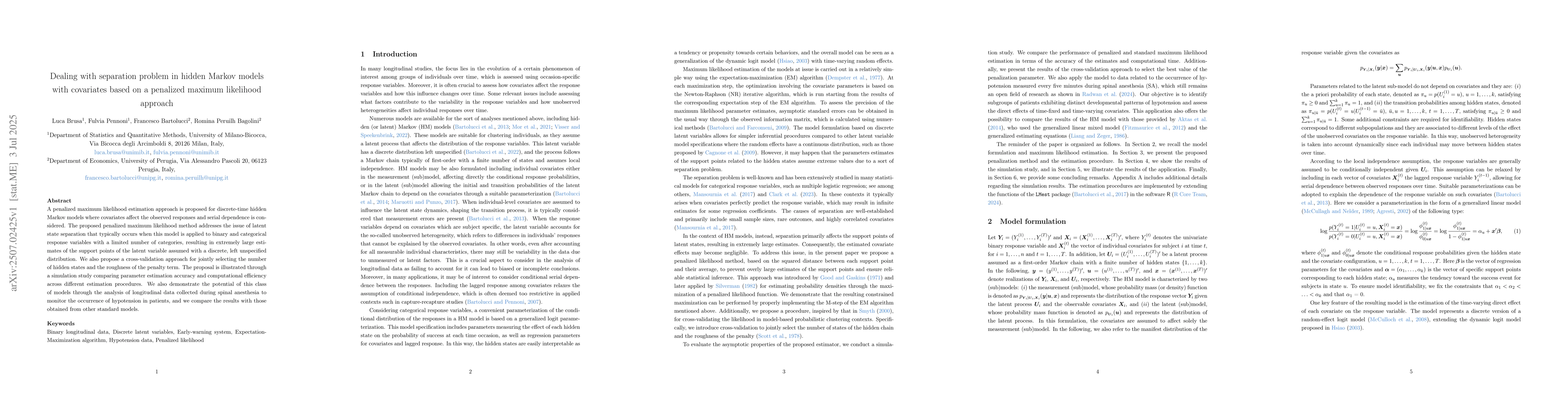 A penalized maximum likelihood estimation approach is proposed for discrete-time hidden Markov models where covariates affect the observed responses and serial dependence is considered. The proposed penalized maximum likelihood method addresses the issue of latent state separation that typically occurs when this model is applied to binary and categorical response variables with a limited number of categories, resulting in extremely large estimates of the support points of the latent variable assumed with a discrete, left unspecified distribution. We also propose a cross-validation approach for jointly selecting the number of hidden states and the roughness of the penalty term. The proposal is illustrated through a simulation study comparing parameter estimation accuracy and computational efficiency across different estimation procedures. We also demonstrate the potential of this class of models through the analysis of longitudinal data collected during spinal anesthesia to monitor the occurrence of hypotension in patients, and we compare the results with those obtained from other standard models.