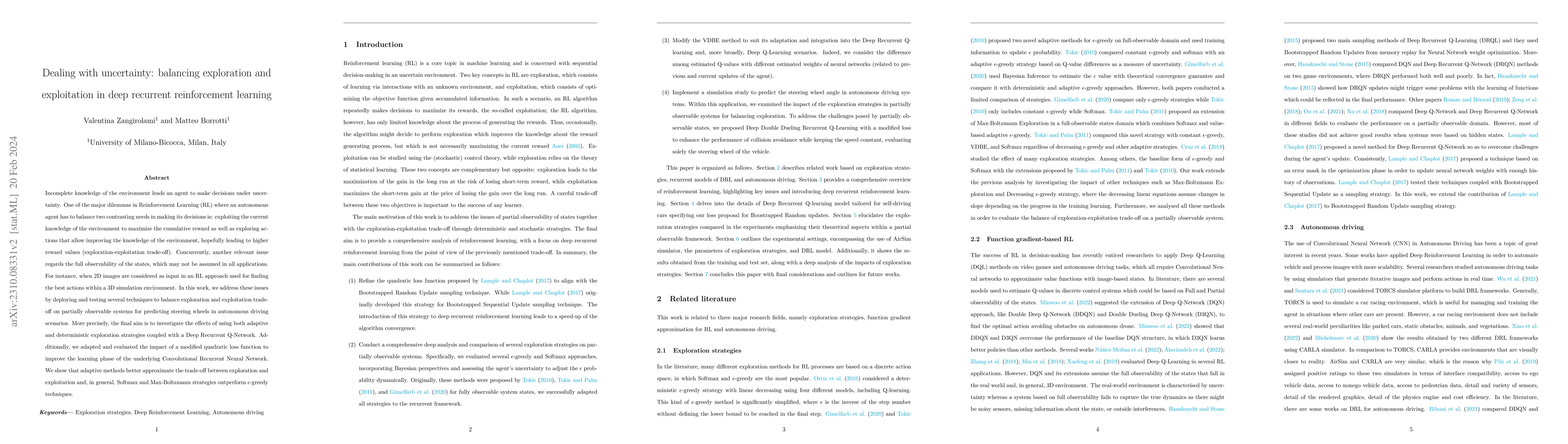 This paper investigates techniques for balancing exploration and exploitation in deep recurrent reinforcement learning under uncertainty, focusing on partially observable environments like autonomous driving. Adaptive exploration strategies, combined with a Deep Recurrent Q-Network and a modified loss function, show better performance than traditional epsilon-greedy methods.