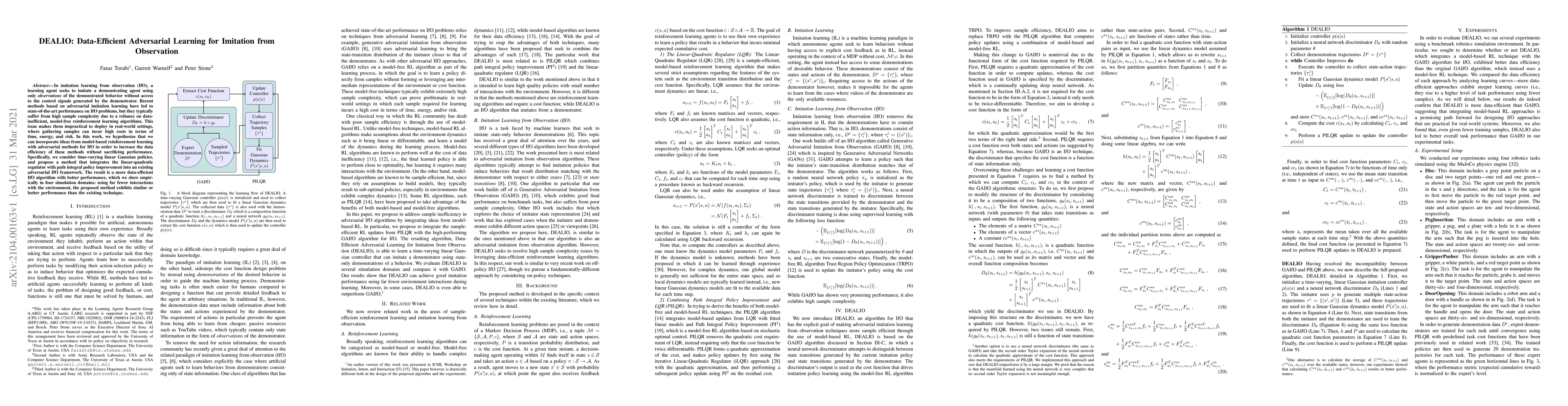 This paper proposes DEALIO, a data-efficient adversarial learning method for imitation from observation that integrates model-based reinforcement learning with adversarial techniques. The method demonstrates improved performance and significantly lower sample complexity compared to existing model-free approaches, as shown in four simulation environments.