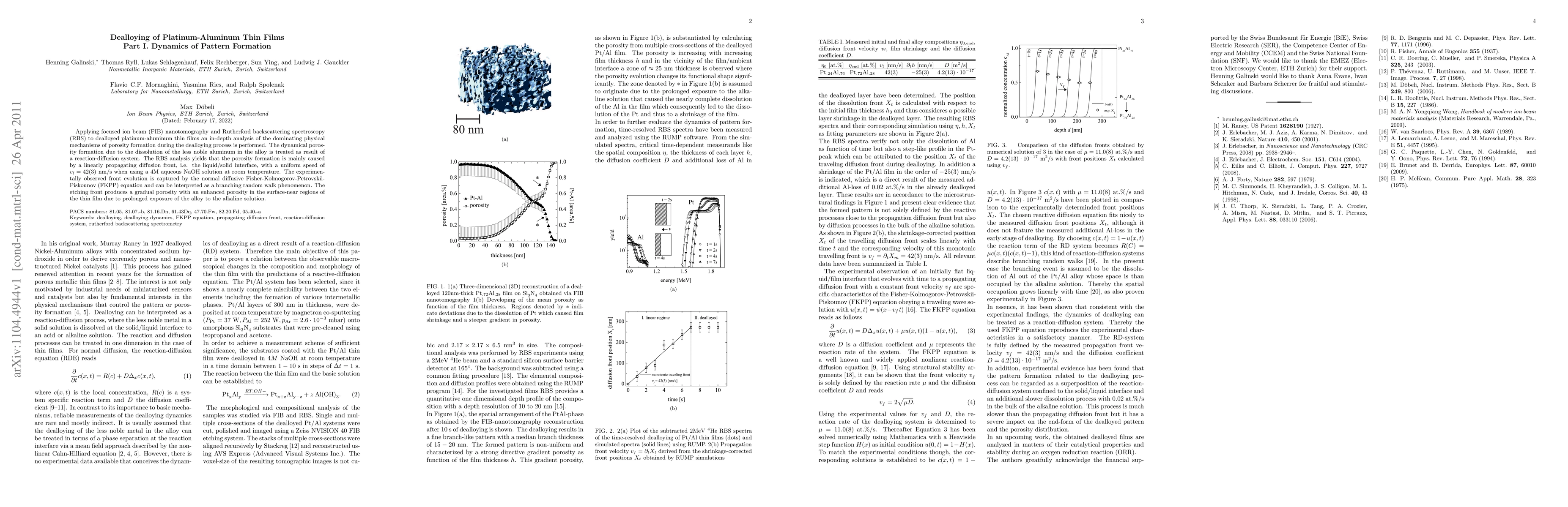 Applying focused ion beam (FIB) nanotomography and Rutherford backscattering spectroscopy (RBS) to dealloyed platinum-aluminum thin films an in-depth analysis of the dominating physical mechanisms of porosity formation during the dealloying process is performed. The dynamical porosity formation due to the dissolution of the less noble aluminum in the alloy is treated as result of a reaction-diffusion system. The RBS analysis yields that the porosity formation is mainly caused by a linearly propagating diffusion front, i.e. the liquid/solid interface, with a uniform speed of 42(3) nm/s when using a 4M aqueous NaOH solution at room temperature. The experimentally observed front evolution is captured by the normal diffusive Fisher-Kolmogorov-Petrovskii-Piskounov (FKPP) equation and can be interpreted as a branching random walk phenomenon. The etching front produces a gradual porosity with an enhanced porosity in the surface-near regions of the thin film due to prolonged exposure of the alloy to the alkaline solution.