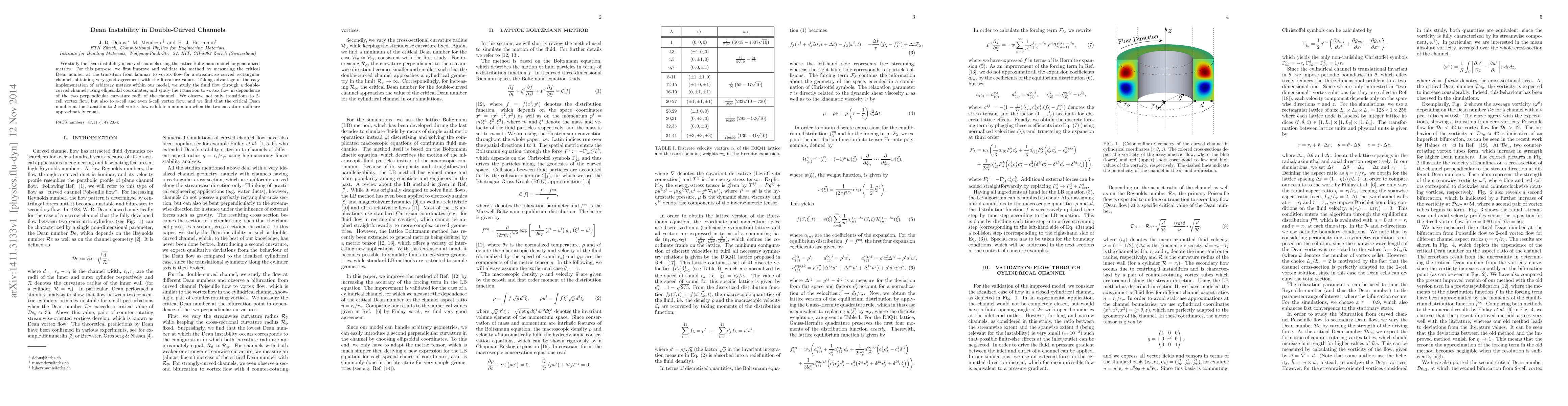 We study the Dean instability in curved channels using the lattice Boltzmann model for generalized metrics. For this purpose, we first improve and validate the method by measuring the critical Dean number at the transition from laminar to vortex flow for a streamwise curved rectangular channel, obtaining very good agreement with the literature values. Taking advantage of the easy implementation of arbitrary metrics within our model, we study the fluid flow through a double-curved channel, using ellipsoidal coordinates, and study the transition to vortex flow in dependence of the two perpendicular curvature radii of the channel. We observe not only transitions to 2-cell vortex flow, but also to 4-cell and even 6-cell vortex flow, and we find that the critical Dean number at the transition to 2-cell vortex flow exhibits a minimum when the two curvature radii are approximately equal.