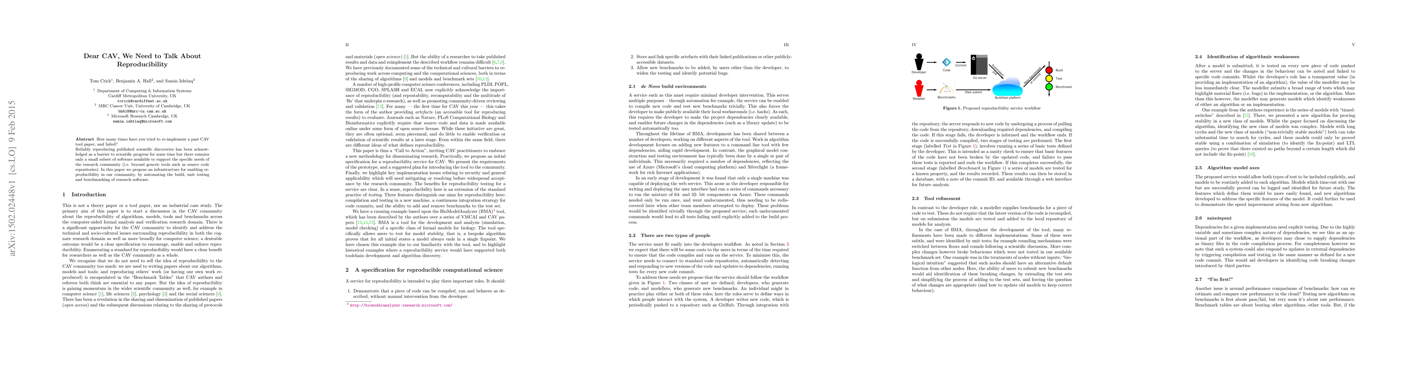 How many times have you tried to re-implement a past CAV tool paper, and failed? Reliably reproducing published scientific discoveries has been acknowledged as a barrier to scientific progress for some time but there remains only a small subset of software available to support the specific needs of the research community (i.e. beyond generic tools such as source code repositories). In this paper we propose an infrastructure for enabling reproducibility in our community, by automating the build, unit testing and benchmarking of research software.