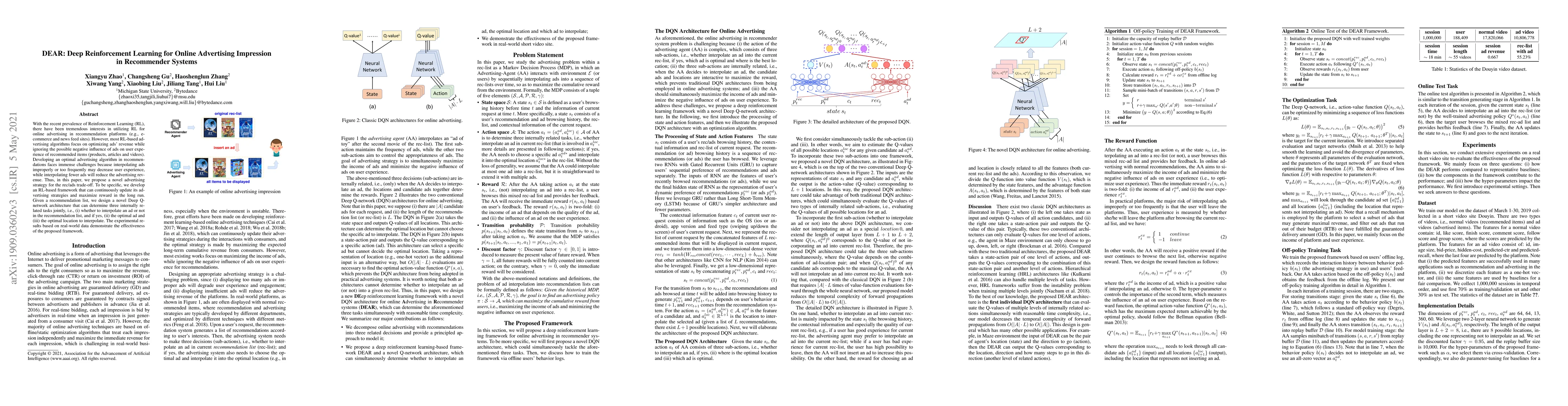 This paper proposes a Deep Reinforcement Learning (RL) framework called DEAR to optimize online advertising impressions in recommender systems by balancing ad revenue and user experience. The framework uses a Deep Q-network to jointly determine ad interpolation, optimal ad selection, and ad placement, demonstrating improved performance through real-world data experiments.