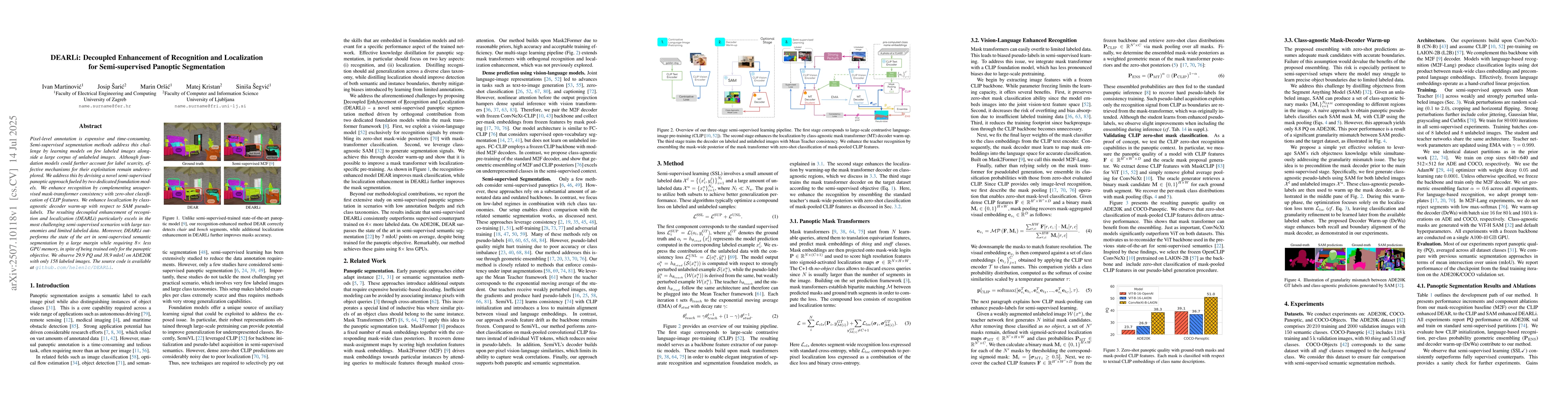 Pixel-level annotation is expensive and time-consuming. Semi-supervised segmentation methods address this challenge by learning models on few labeled images alongside a large corpus of unlabeled images. Although foundation models could further account for label scarcity, effective mechanisms for their exploitation remain underexplored. We address this by devising a novel semi-supervised panoptic approach fueled by two dedicated foundation models. We enhance recognition by complementing unsupervised mask-transformer consistency with zero-shot classification of CLIP features. We enhance localization by class-agnostic decoder warm-up with respect to SAM pseudo-labels. The resulting decoupled enhancement of recognition and localization (DEARLi) particularly excels in the most challenging semi-supervised scenarios with large taxonomies and limited labeled data. Moreover, DEARLi outperforms the state of the art in semi-supervised semantic segmentation by a large margin while requiring 8x less GPU memory, in spite of being trained only for the panoptic objective. We observe 29.9 PQ and 38.9 mIoU on ADE20K with only 158 labeled images. The source code is available at https://github.com/helen1c/DEARLi.