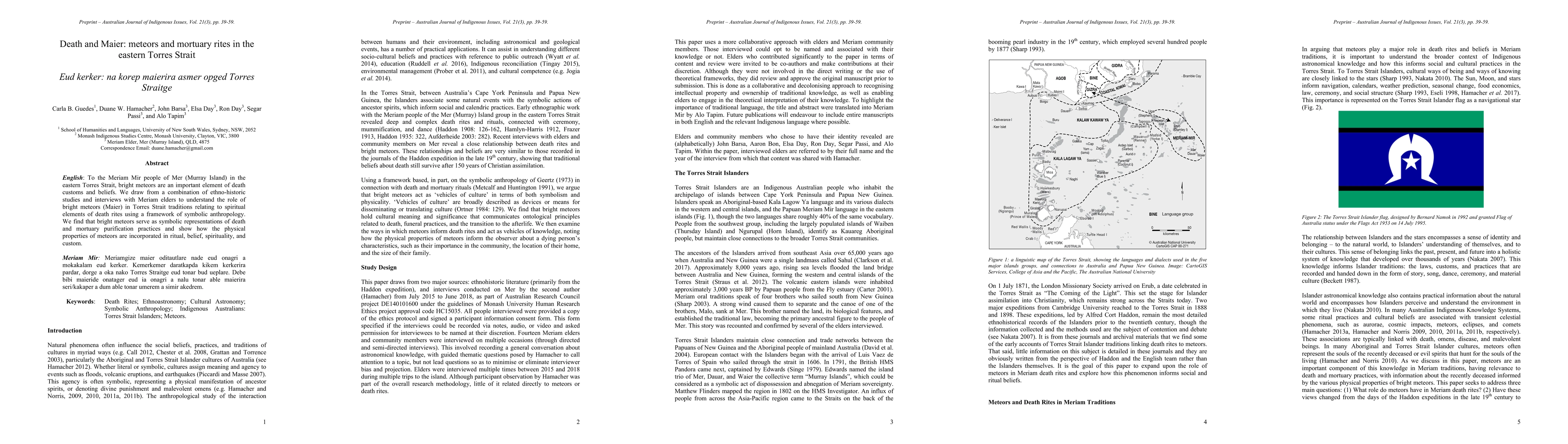 English: To the Meriam Mir people of Mer (Murray Island) in the eastern Torres Strait, bright meteors are an important element of death customs and beliefs. We draw from a combination of ethno-historic studies and interviews with Meriam elders to understand the role of bright meteors (Maier) in Torres Strait traditions relating to spiritual elements of death rites using a framework of symbolic anthropology. We find that bright meteors serve as symbolic representations of death and mortuary purification practices and show how the physical properties of meteors are incorporated in ritual, belief, spirituality, and custom. Meriam Mir: Meriamgize maier oditautlare nade eud onagri a mokakalam eud kerker. Kemerkemer daratkapda kikem kerkerira pardar, dorge a oka nako Torres Straitge eud tonar bud ueplare. Debe bibi maieride onatager eud ia onagri a nalu tonar able maierira seri/kakaper a dum able tonar umerem a simir akedrem.