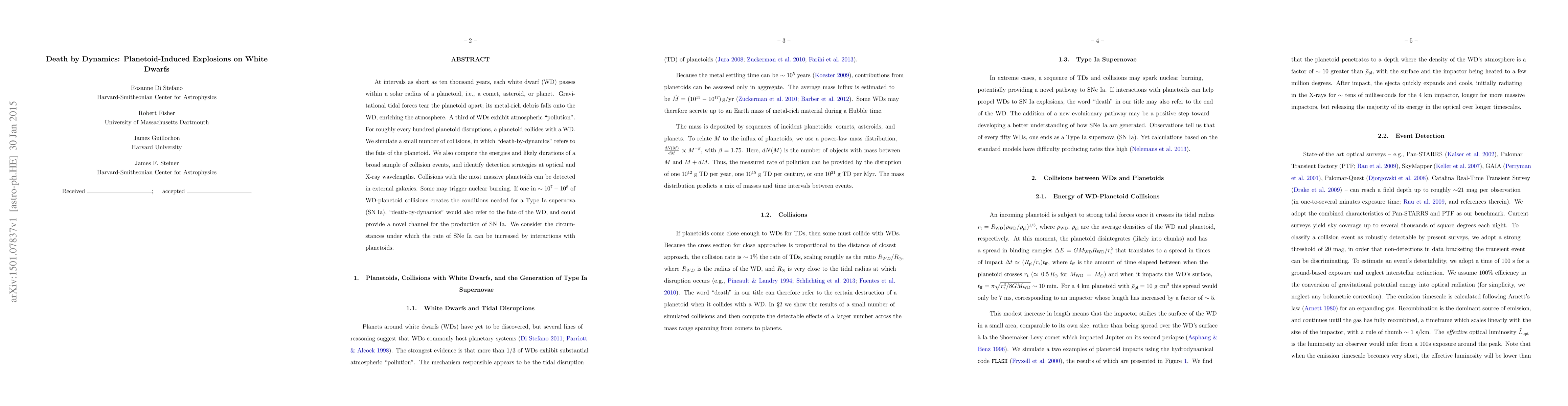At intervals as short as ten thousand years, each white dwarf (WD) passes within a solar radius of a planetoid, i.e., a comet, asteroid, or planet. Gravitational tidal forces tear the planetoid apart; its metal-rich debris falls onto the WD, enriching the atmosphere. A third of WDs exhibit atmospheric "pollution". For roughly every hundred planetoid disruptions, a planetoid collides with a WD. We simulate a small number of collisions, in which "death-by-dynamics" refers to the fate of the planetoid. We also compute the energies and likely durations of a broad sample of collision events, and identify detection strategies at optical and X-ray wavelengths. Collisions with the most massive planetoids can be detected in external galaxies. Some may trigger nuclear burning. If one in $\sim 10^7-10^8$ of WD-planetoid collisions creates the conditions needed for a Type Ia supernova (SN~Ia), "death-by-dynamics" would also refer to the fate of the WD, and could provide a novel channel for the production of SN~Ia. We consider the circumstances under which the rate of SNe~Ia can be increased by interactions with planetoids.