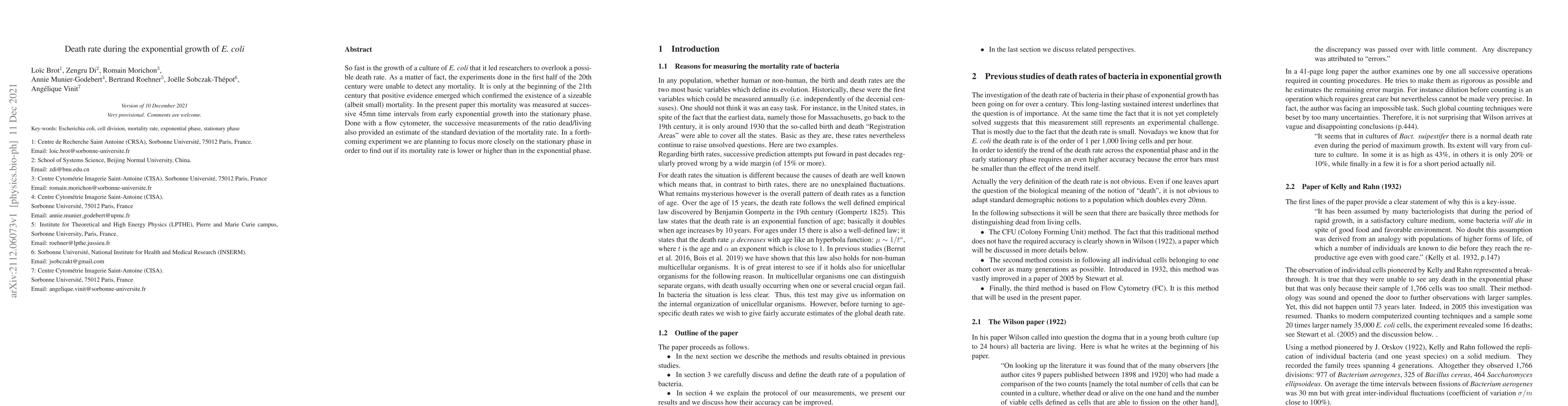 So fast is the growth of a culture of E. coli that it led researchers to overlook a possible death rate. As a matter of fact, the experiments done in the first half of the 20th century were unable to detect any mortality. It is only at the beginning of the 21th century that positive evidence emerged which confirmed the existence of a sizeable (albeit small) mortality. In the present paper this mortality was measured at successive 45mn time intervals from early exponential growth into the stationary phase. Done with a flow cytometer, the successive measurements of the ratio dead/living also provided an estimate of the standard deviation of the mortality rate. In a forthcoming experiment we are planning to focus more closely on the stationary phase in order to find out if its mortality rate is lower or higher than in the exponential phase.
