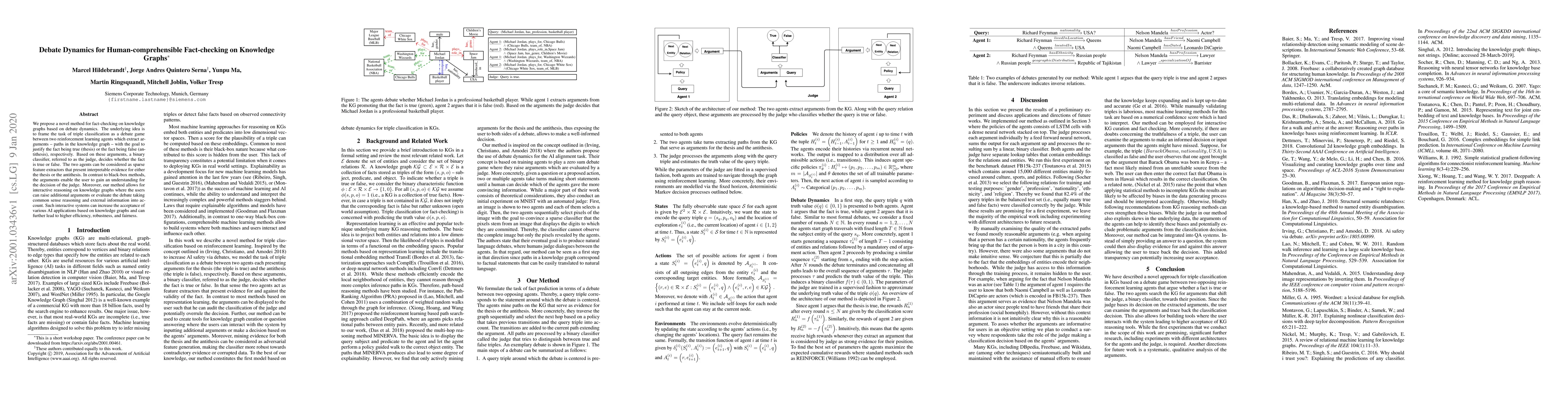 This paper proposes a novel method for fact-checking on knowledge graphs by framing triple classification as a debate game between two reinforcement learning agents. The agents extract interpretable paths (arguments) in the graph to justify a fact's truth or falsehood, allowing for user understanding and interactive reasoning, which can enhance the acceptance and efficiency of AI applications.