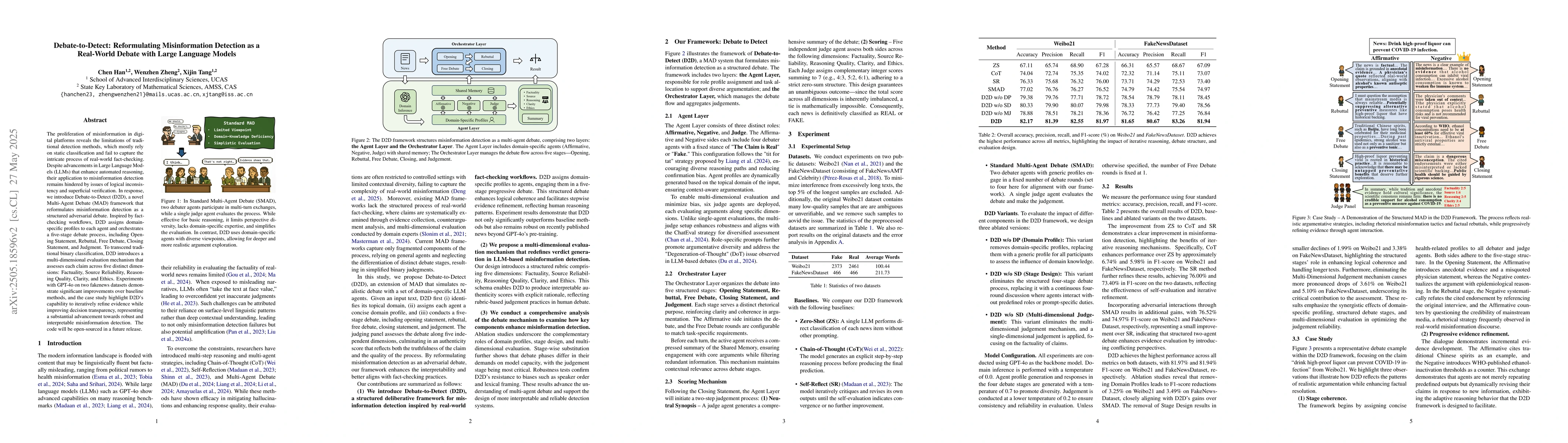 The development of a novel Multi-Agent Debate framework (D2D) for misinformation detection, incorporating a multi-dimensional evaluation mechanism.