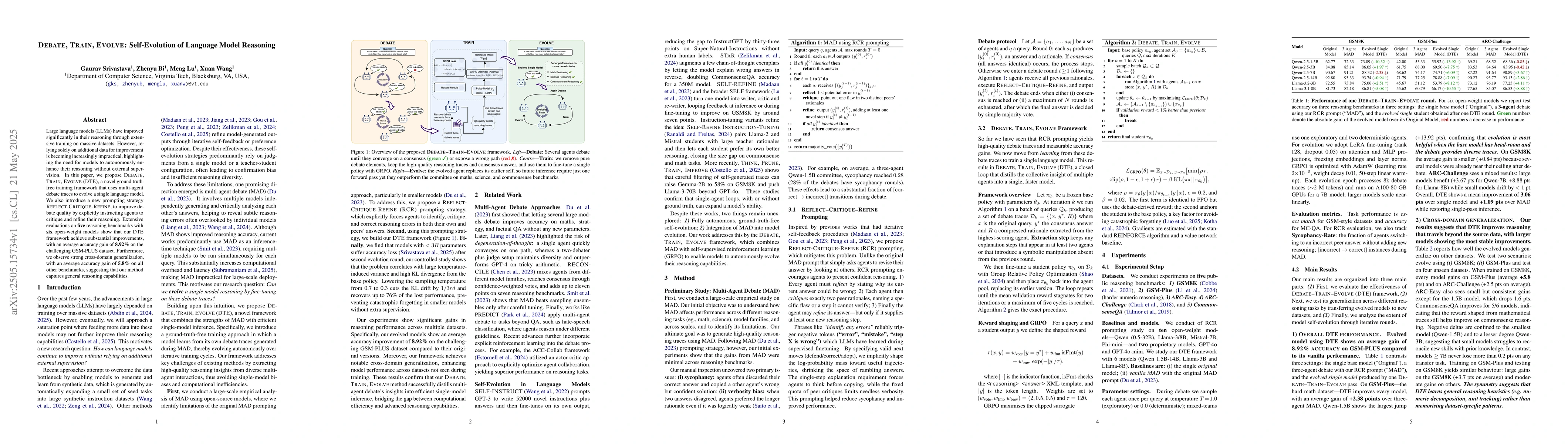 Large language models can improve their reasoning without external supervision using a new framework called Debate, Train, Evolve, which uses multi-agent debate traces to evolve a single model and achieves substantial improvements on various benchmarks.