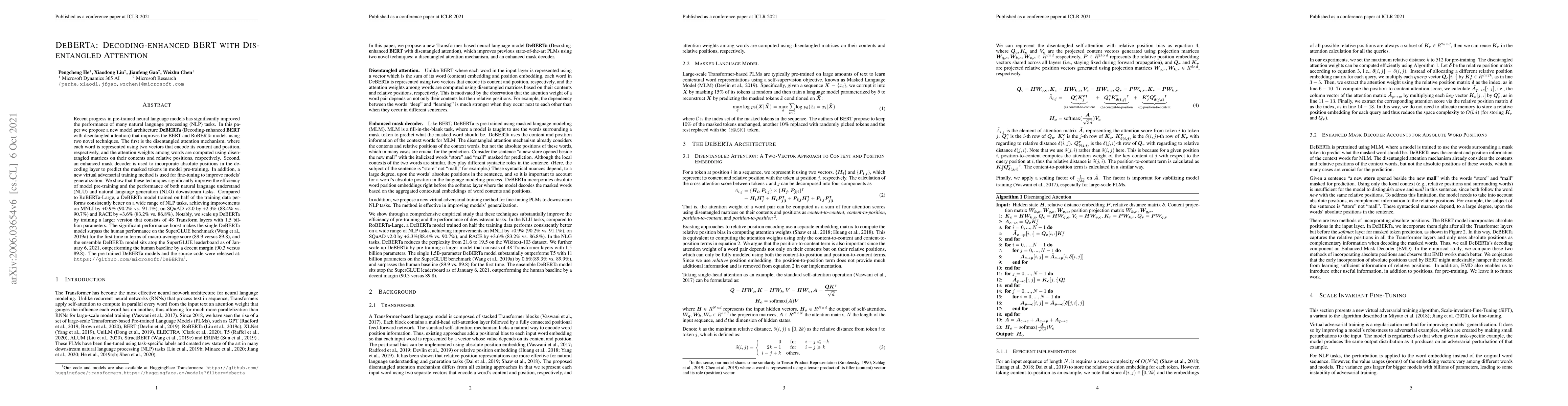 DeBERTa enhances BERT and RoBERTa models using disentangled attention and an enhanced mask decoder, achieving superior performance on various NLP tasks and surpassing human performance on the SuperGLUE benchmark.
