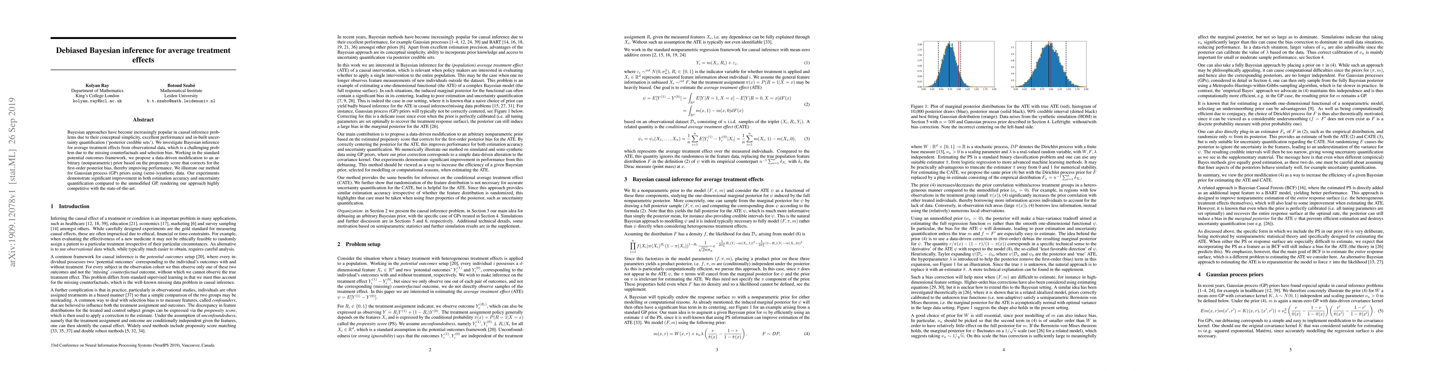 This paper proposes a method to debias Bayesian inference for estimating average treatment effects from observational data, addressing selection bias and missing counterfactuals. The approach modifies an arbitrary prior based on the propensity score to correct for first-order posterior bias, significantly improving estimation accuracy and uncertainty quantification, as demonstrated through experiments with Gaussian process priors.
