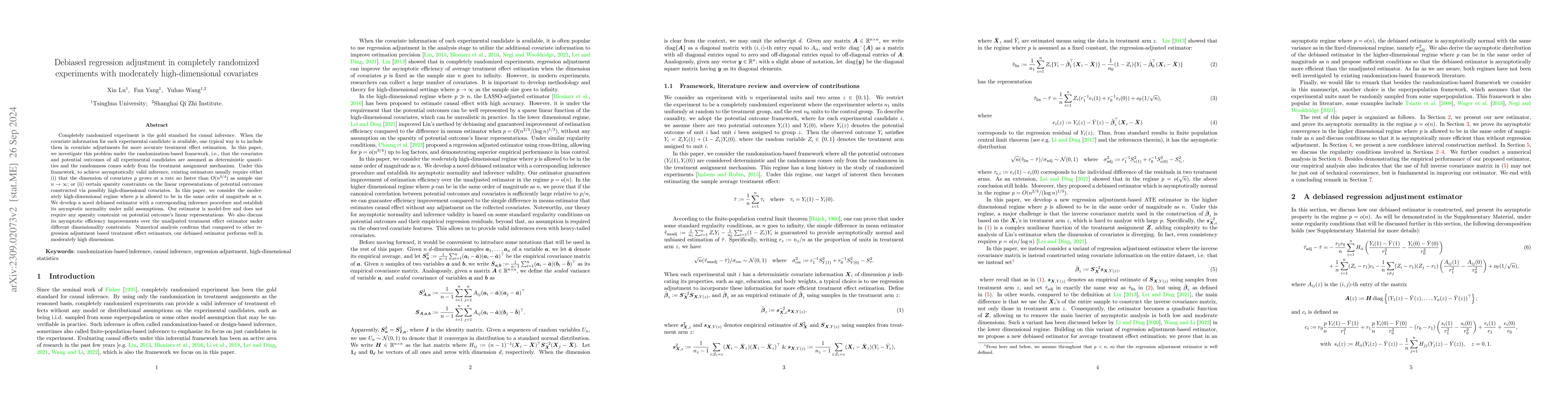 This paper develops a novel debiased estimator for treatment effect estimation in completely randomized experiments with moderately high-dimensional covariates, achieving asymptotic normality and efficiency without requiring sparsity constraints. The method outperforms traditional regression adjustment estimators in numerical analysis.
