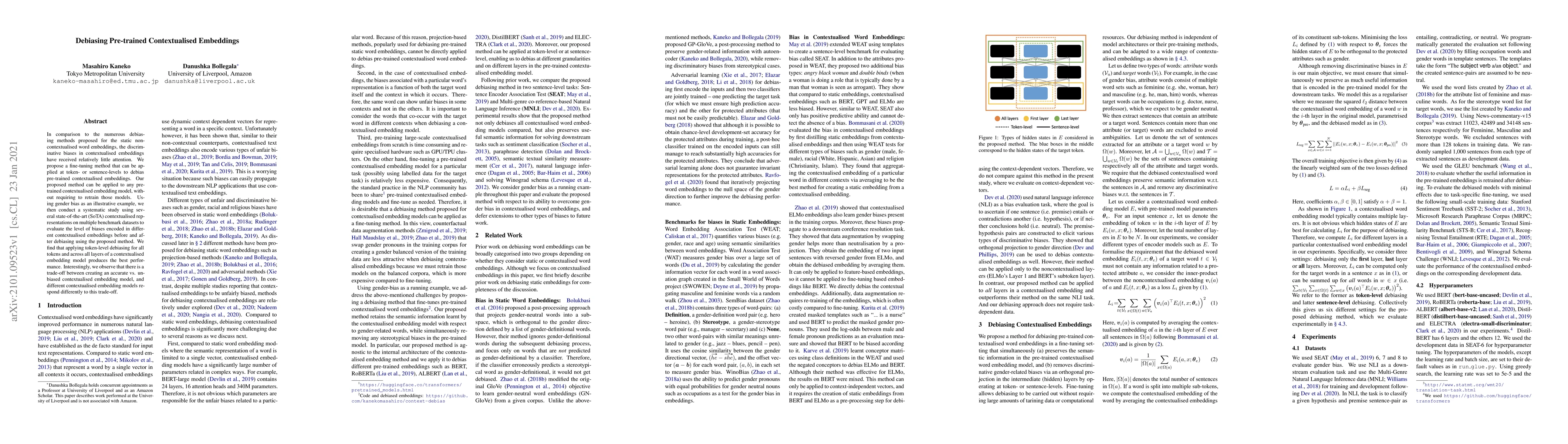 This paper proposes a fine-tuning method for debiasing pre-trained contextualised embeddings at token or sentence levels, applicable to any such model without retraining. The study finds that token-level debiasing across all layers is most effective, though it notes a trade-off between accuracy and bias reduction, with varying responses among different models.