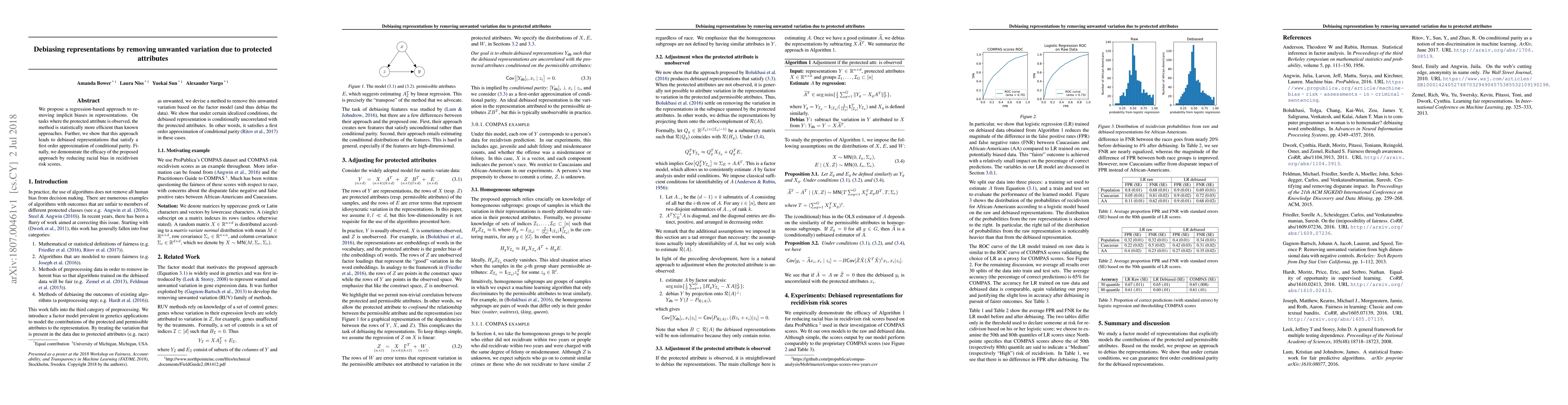 This paper proposes a regression-based method to eliminate implicit biases in representations, achieving statistical efficiency and conditional parity. The approach effectively reduces racial bias in recidivism risk scores.