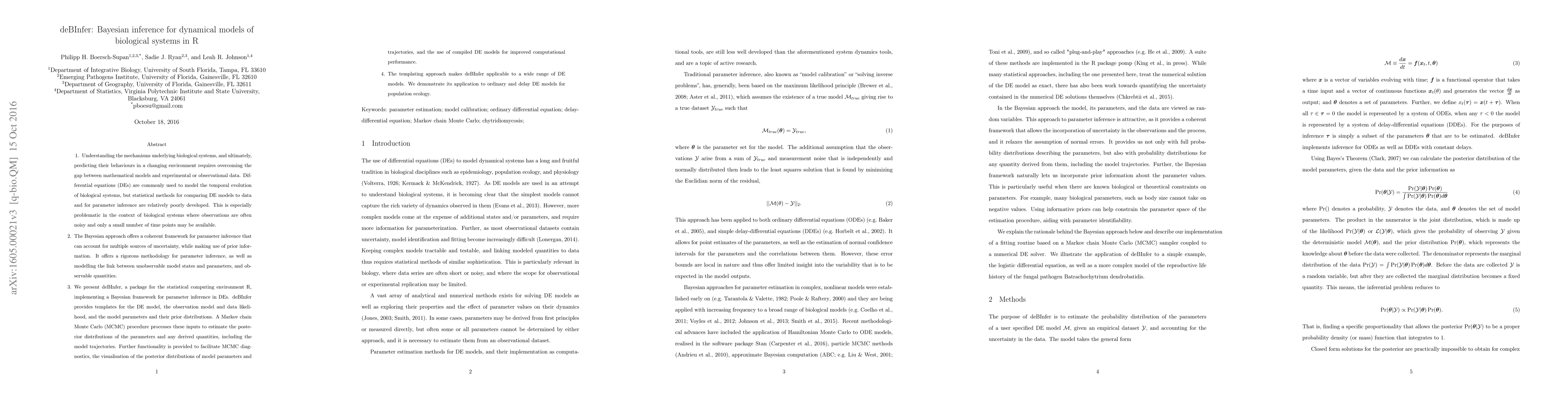 deBInfer is a Bayesian inference package for R that enables efficient parameter estimation in dynamic biological models, addressing the gap between mathematical models and experimental data.