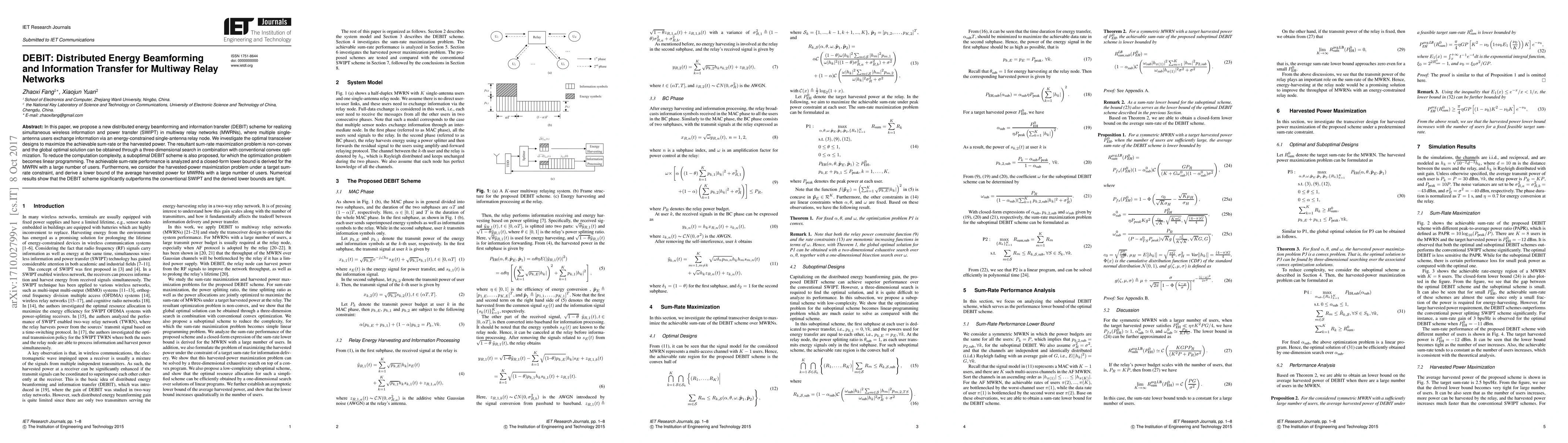 This paper introduces a DEBIT scheme for multiway relay networks to optimize simultaneous wireless information and power transfer, leveraging distributed energy beamforming. It proposes optimal and suboptimal designs to maximize sum-rate or harvested power, with numerical results showing significant performance improvements over conventional methods.