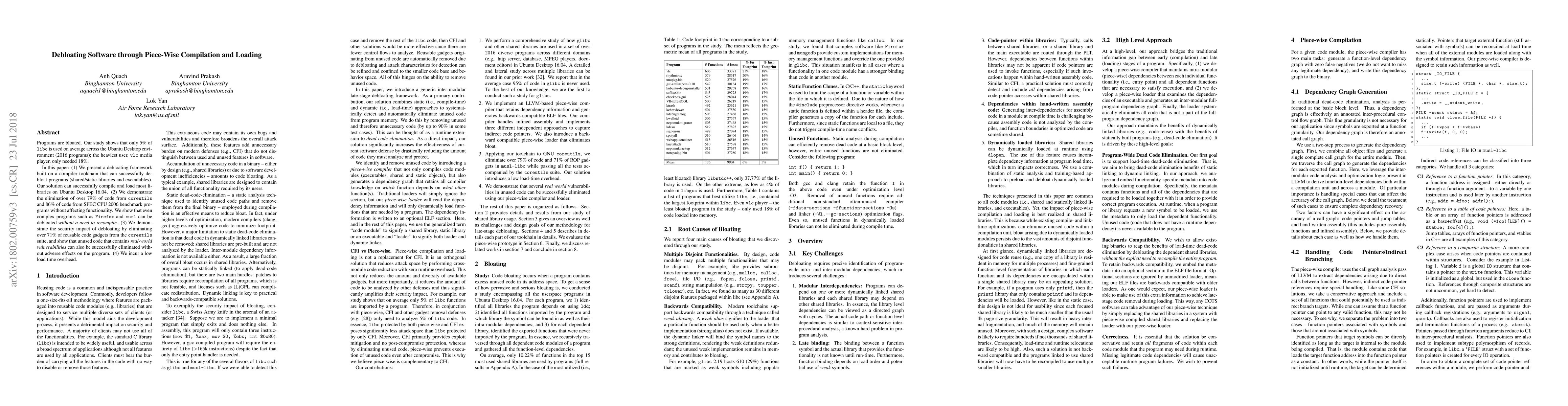 Programs are bloated. Our study shows that only 5% of libc is used on average across the Ubuntu Desktop environment (2016 programs); the heaviest user, vlc media player, only needed 18%. In this paper: (1) We present a debloating framework built on a compiler toolchain that can successfully debloat programs (shared/static libraries and executables). Our solution can successfully compile and load most libraries on Ubuntu Desktop 16.04. (2) We demonstrate the elimination of over 79% of code from coreutils and 86% of code from SPEC CPU 2006 benchmark programs without affecting functionality. We show that even complex programs such as Firefox and curl can be debloated without a need to recompile. (3) We demonstrate the security impact of debloating by eliminating over 71% of reusable code gadgets from the coreutils suite and show that unused code that contains real-world vulnerabilities can also be successfully eliminated without adverse effects on the program. (4) We incur a low load time overhead.