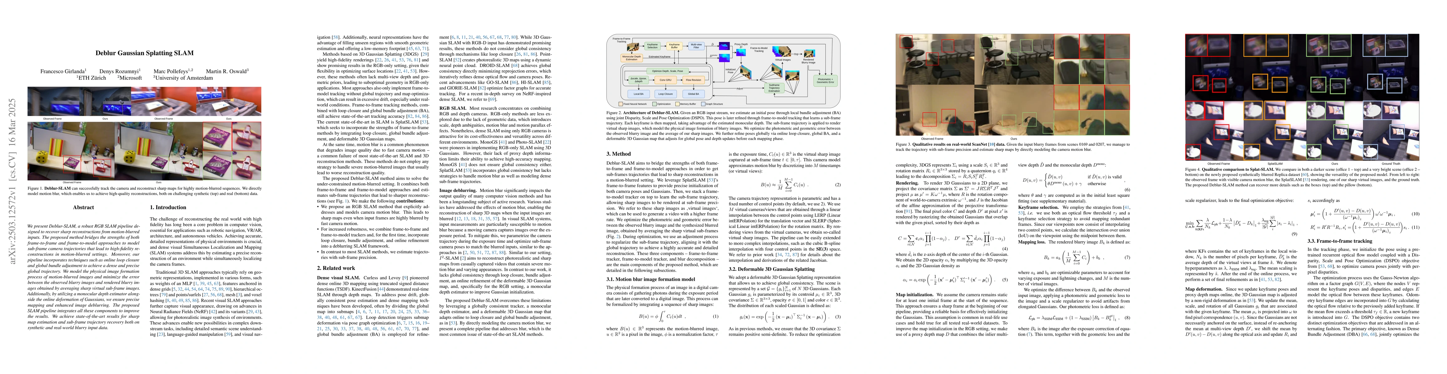 The paper introduces a novel RGB SLAM pipeline, Deblur-SLAM, that models physical image formation of motion-blurred images and ensures sharp, sub-frame, and precise mapping using monocular depth estimation and online Gaussian deformation.