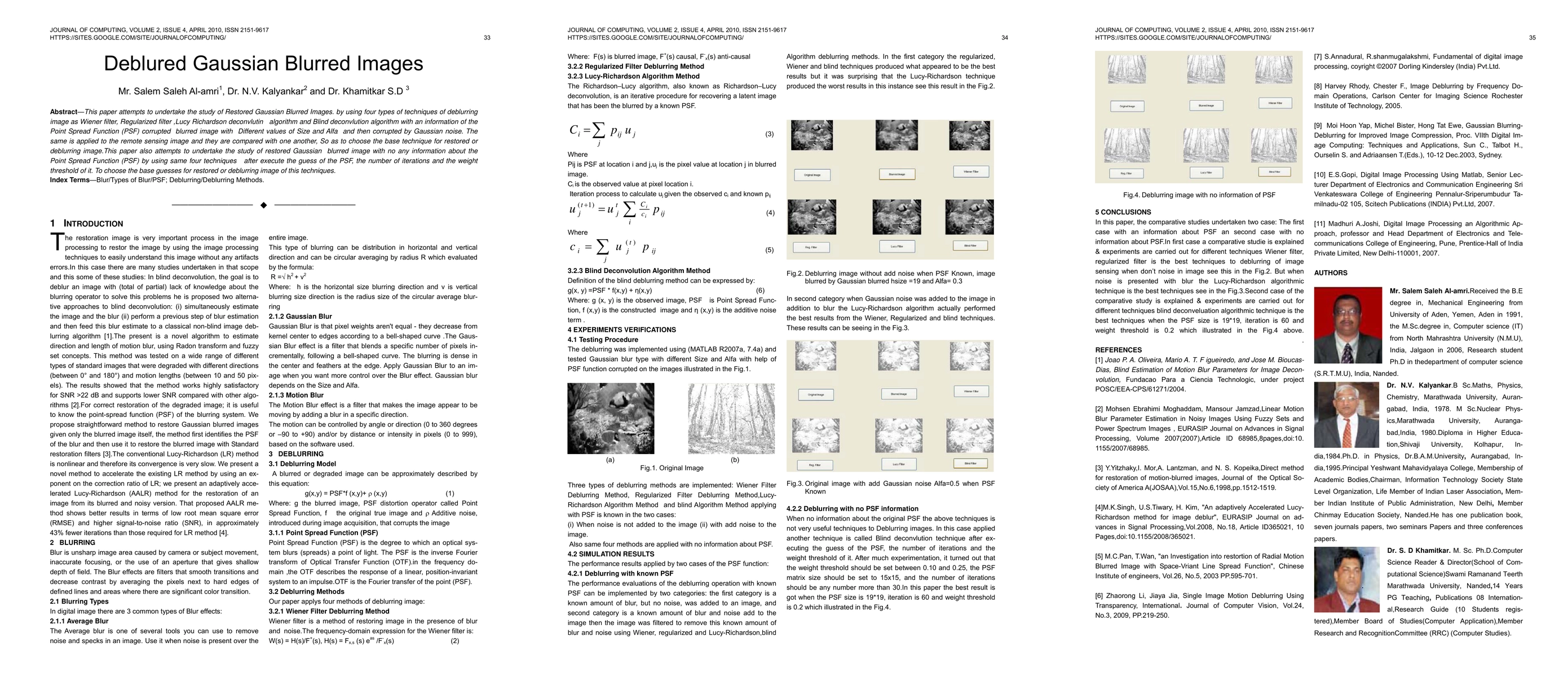 This paper compares four deblurring techniques for restoring Gaussian blurred images, including Wiener filter, Regularized filter, Lucy Richardson algorithm, and Blind deconvolution, with varying parameters and noise levels.