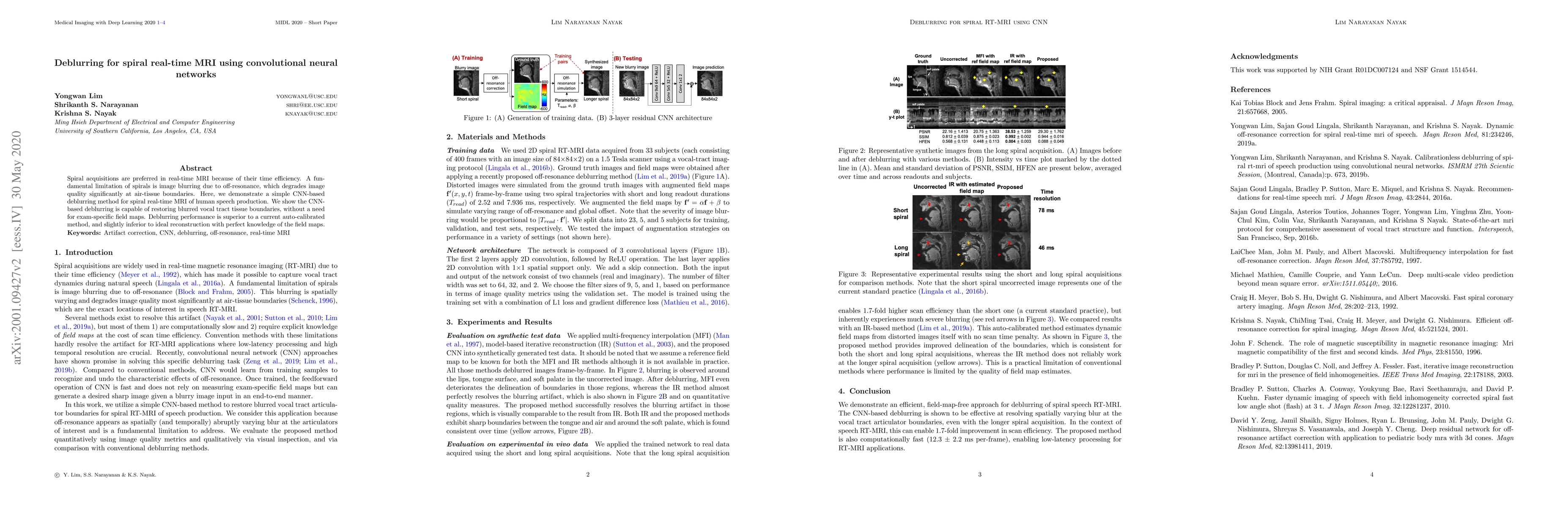 Spiral acquisitions are preferred in real-time MRI because of their time efficiency. A fundamental limitation of spirals is image blurring due to off-resonance, which degrades image quality significantly at air-tissue boundaries. Here, we demonstrate a simple CNN-based deblurring method for spiral real-time MRI of human speech production. We show the CNN-based deblurring is capable of restoring blurred vocal tract tissue boundaries, without a need for exam-specific field maps. Deblurring performance is superior to a current auto-calibrated method, and slightly inferior to ideal reconstruction with perfect knowledge of the field maps.