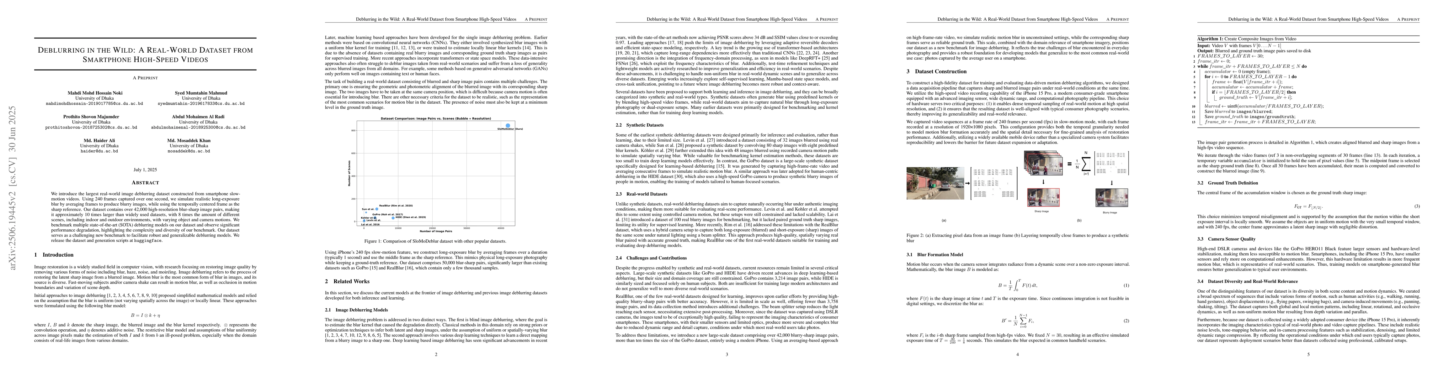 The paper introduces a large-scale real-world image deblurring dataset constructed from high-frame-rate smartphone videos. Using the iPhone 15 Pro's 240fps slow-motion capture, they synthesized realistic motion blur through temporal averaging, pairing each blurred image with a temporally aligned sharp ground truth.