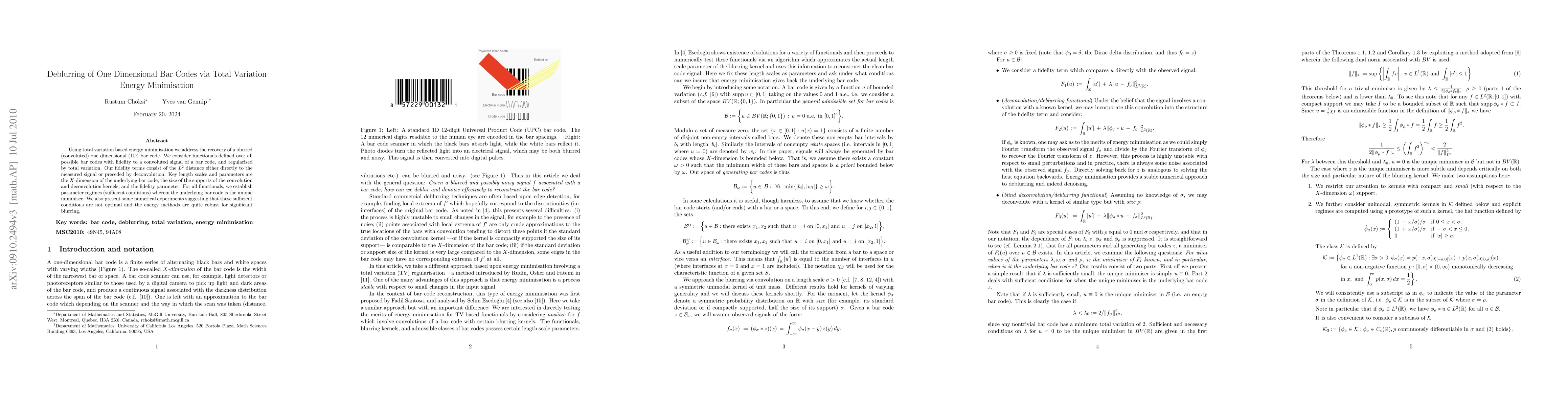 Using total variation based energy minimisation we address the recovery of a blurred (convoluted) one dimensional (1D) barcode. We consider functionals defined over all possible barcodes with fidelity to a convoluted signal of a barcode, and regularised by total variation. Our fidelity terms consist of the L^2 distance either directly to the measured signal or preceded by deconvolution. Key length scales and parameters are the X-dimension of the underlying barcode, the size of the supports of the convolution and deconvolution kernels, and the fidelity parameter. For all functionals, we establish regimes (sufficient conditions) wherein the underlying barcode is the unique minimiser. We also present some numerical experiments suggesting that these sufficient conditions are not optimal and the energy methods are quite robust for significant blurring.