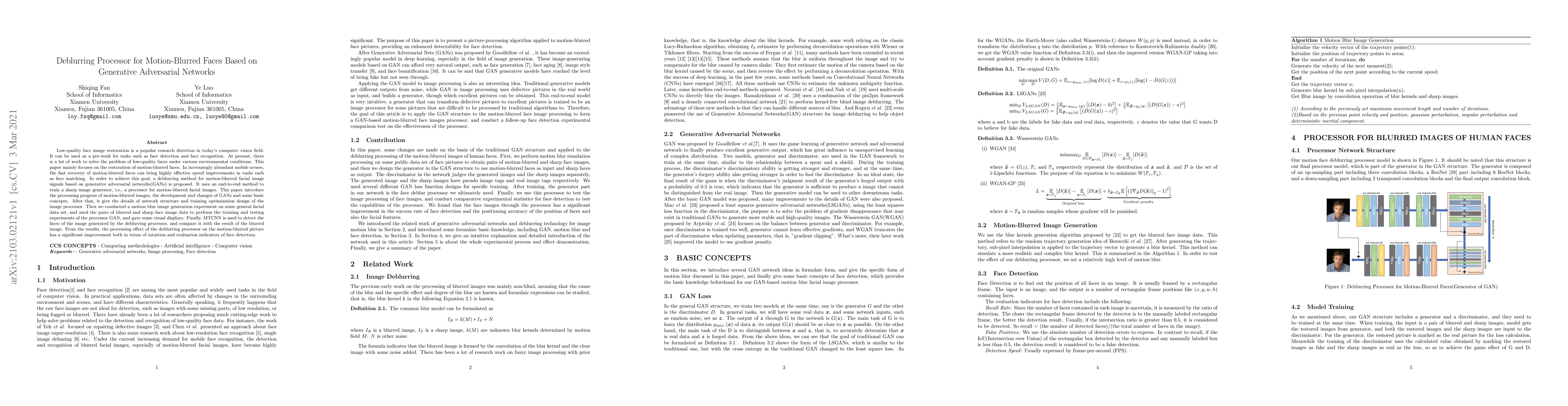 This paper proposes a deblurring processor for motion-blurred faces using generative adversarial networks (GANs) to restore low-quality facial images. The method significantly improves face detection and recognition in motion-blurred images, demonstrating effective speed improvements in face matching tasks.