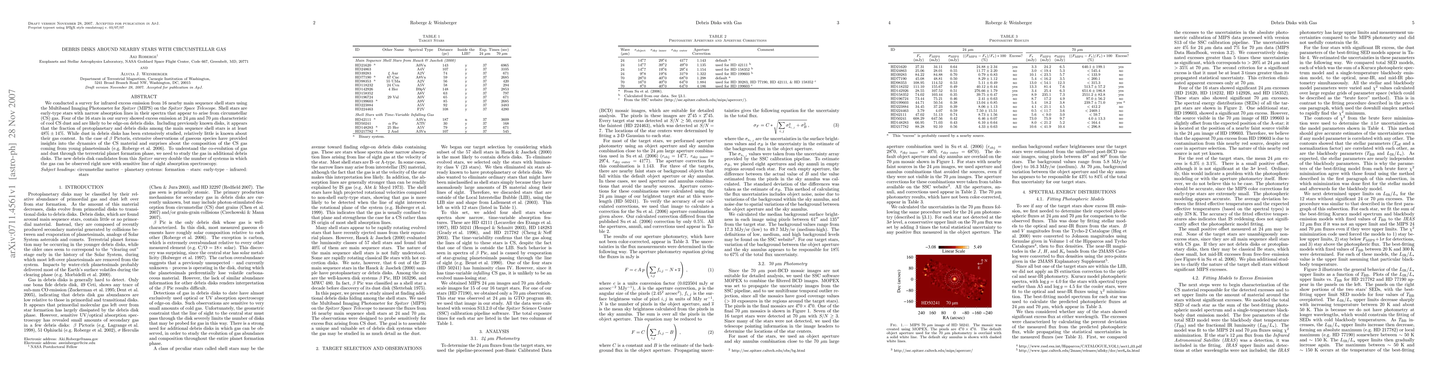 We conducted a survey for infrared excess emission from 16 nearby main sequence shell stars using the Multiband Imaging Photometer for Spitzer (MIPS) on the Spitzer Space Telescope. Shell stars are early-type stars with narrow absorption lines in their spectra that appear to arise from circumstellar (CS) gas. Four of the 16 stars in our survey showed excess emission at 24 microns and 70 microns characteristic of cool CS dust and are likely to be edge-on debris disks. Including previously known disks, it appears that the fraction of protoplanetary and debris disks among the main sequence shell stars is at least 48% +/- 14%. While dust in debris disks has been extensively studied, relatively little is known about their gas content. In the case of Beta Pictoris, extensive observations of gaseous species have provided insights into the dynamics of the CS material and surprises about the composition of the CS gas coming from young planetesimals (e.g. Roberge et al. 2006). To understand the co-evolution of gas and dust through the terrestrial planet formation phase, we need to study the gas in additional debris disks. The new debris disk candidates from this Spitzer survey double the number of systems in which the gas can be observed right now with sensitive line of sight absorption spectroscopy.