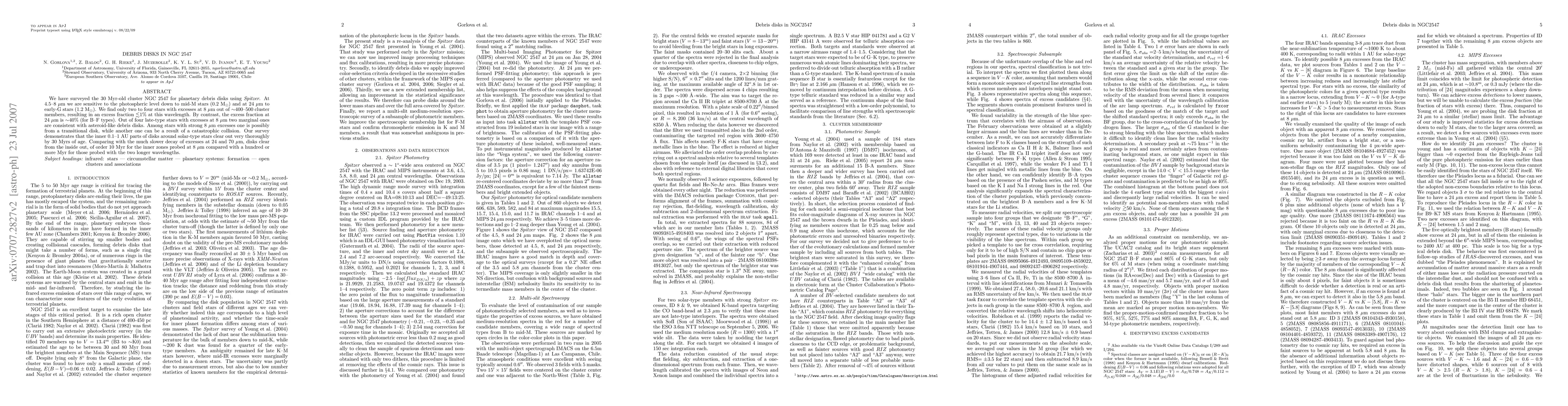 This study using Spitzer finds debris disks in the NGC 2547 cluster, revealing that inner disk regions clear out efficiently by 30 Myrs, while longer wavelengths show slower decay, indicating a disk clearing process that starts from the inside out. The survey identifies only two to four stars with 8 um excesses out of ~400-500 members, suggesting an excess fraction of <~1 percent.