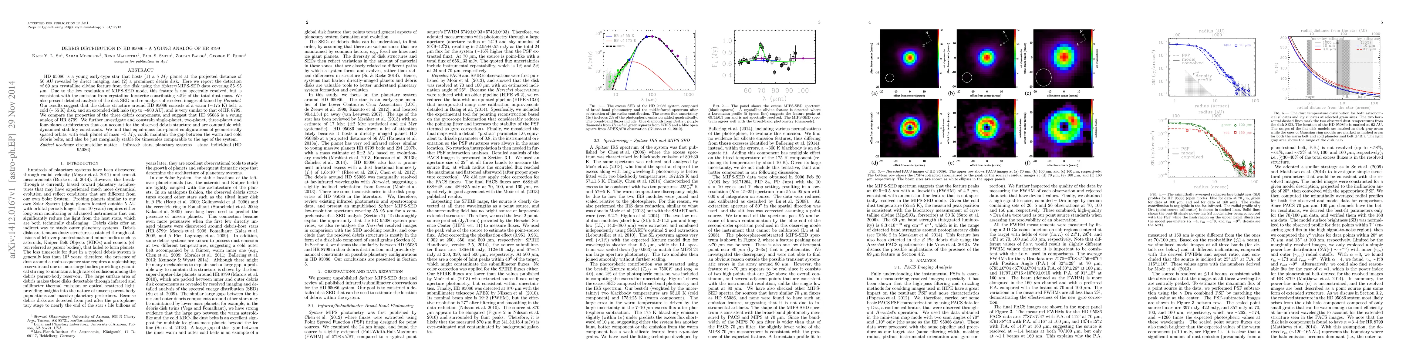 This paper investigates the debris disk around HD 95086, identifying a crystalline olivine feature and analyzing its structure, which includes a warm belt, a cold disk, and an extended disk halo. The findings suggest HD 95086's debris structure is analogous to HR 8799, and propose four-planet configurations to explain the observed debris distribution.