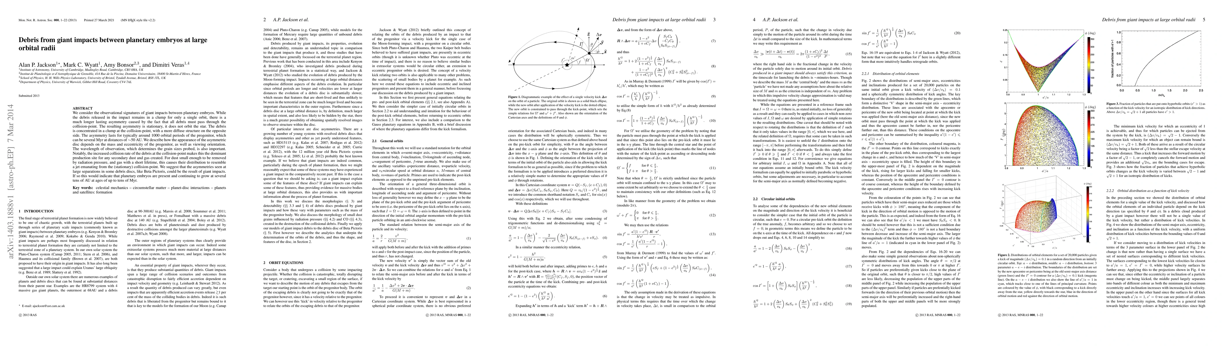 We consider the observational signatures of giant impacts between planetary embryos. While the debris released in the impact remains in a clump for only a single orbit, there is a much longer lasting asymmetry caused by the fact that all debris must pass through the collision-point. The resulting asymmetry is stationary, it does not orbit the star. The debris is concentrated in a clump at the collision-point, with a more diffuse structure on the opposite side. The asymmetry lasts for typically around 1000 orbital periods of the progenitor, which can be several Myr at distances of ~50 AU. We describe how the appearance of the asymmetric disc depends on the mass and eccentricity of the progenitor, as well as viewing orientation. The wavelength of observation, which determines the grain sizes probed, is also important. Notably, the increased collision rate of the debris at the collision-point makes this the dominant production site for any secondary dust and gas created. For dust small enough to be removed by radiation pressure, and gas with a short lifetime, this causes their distribution to resemble a jet emanating from the (stationary) collision-point. We suggest that the asymmetries seen at large separations in some debris discs, like Beta Pictoris, could be the result of giant impacts. If so this would indicate that planetary embryos are present and continuing to grow at several tens of AU at ages of up to tens of Myr.