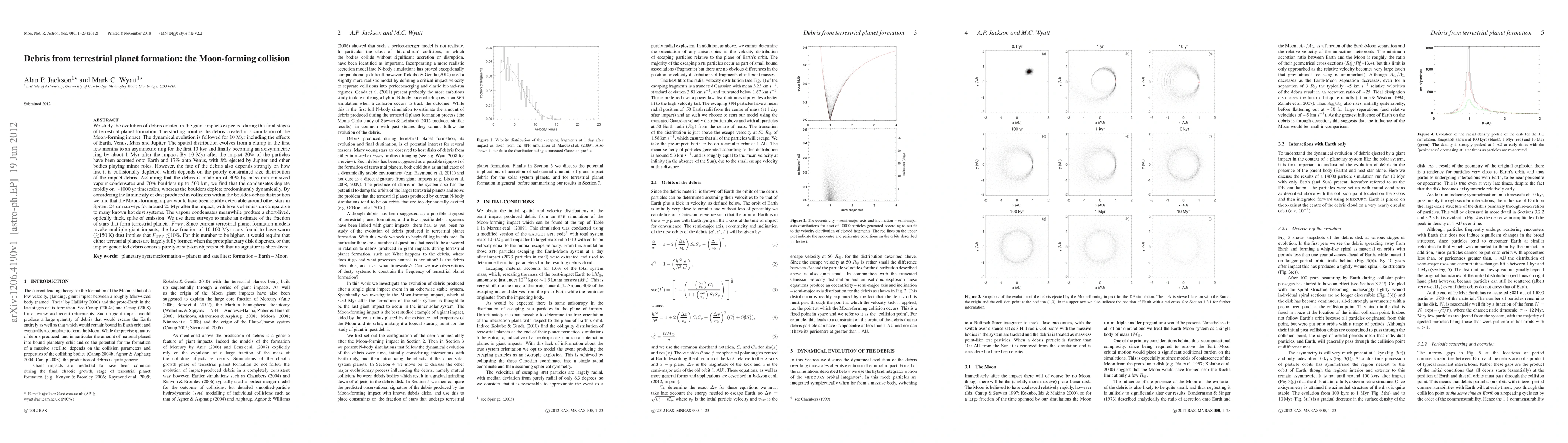 This paper investigates the evolution of debris from the Moon-forming giant impact, showing its transition from a clump to an axisymmetric ring over millions of years. It estimates that 20% of the debris is accreted by Earth and 17% by Venus, with 8% ejected by Jupiter, and suggests that the Moon-forming event could have been detectable in Spitzer surveys for 25 Myr due to its luminosity.