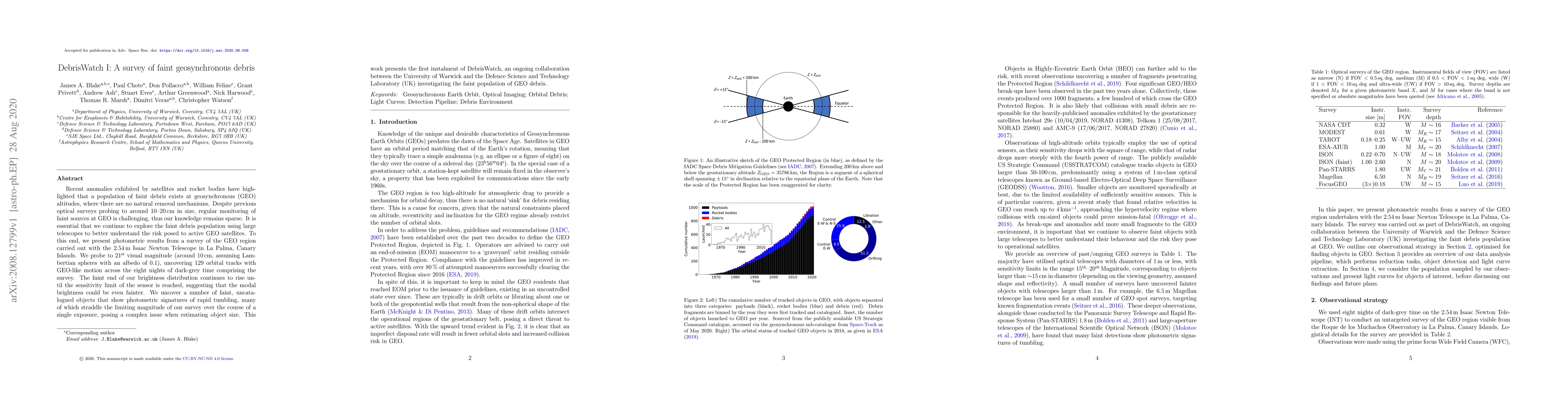 Recent anomalies exhibited by satellites and rocket bodies have highlighted that a population of faint debris exists at geosynchronous (GEO) altitudes, where there are no natural removal mechanisms. Despite previous optical surveys probing to around 10-20 cm in size, regular monitoring of faint sources at GEO is challenging, thus our knowledge remains sparse. It is essential that we continue to explore the faint debris population using large telescopes to better understand the risk posed to active GEO satellites. To this end, we present photometric results from a survey of the GEO region carried out with the 2.54 m Isaac Newton Telescope in La Palma, Canary Islands. We probe to 21st visual magnitude (around 10 cm, assuming Lambertian spheres with an albedo of 0.1), uncovering 129 orbital tracks with GEO-like motion across the eight nights of dark-grey time comprising the survey. The faint end of our brightness distribution continues to rise until the sensitivity limit of the sensor is reached, suggesting that the modal brightness could be even fainter. We uncover a number of faint, uncatalogued objects that show photometric signatures of rapid tumbling, many of which straddle the limiting magnitude of our survey over the course of a single exposure, posing a complex issue when estimating object size. This work presents the first instalment of DebrisWatch, an ongoing collaboration between the University of Warwick and the Defence Science and Technology Laboratory (UK) investigating the faint population of GEO debris.