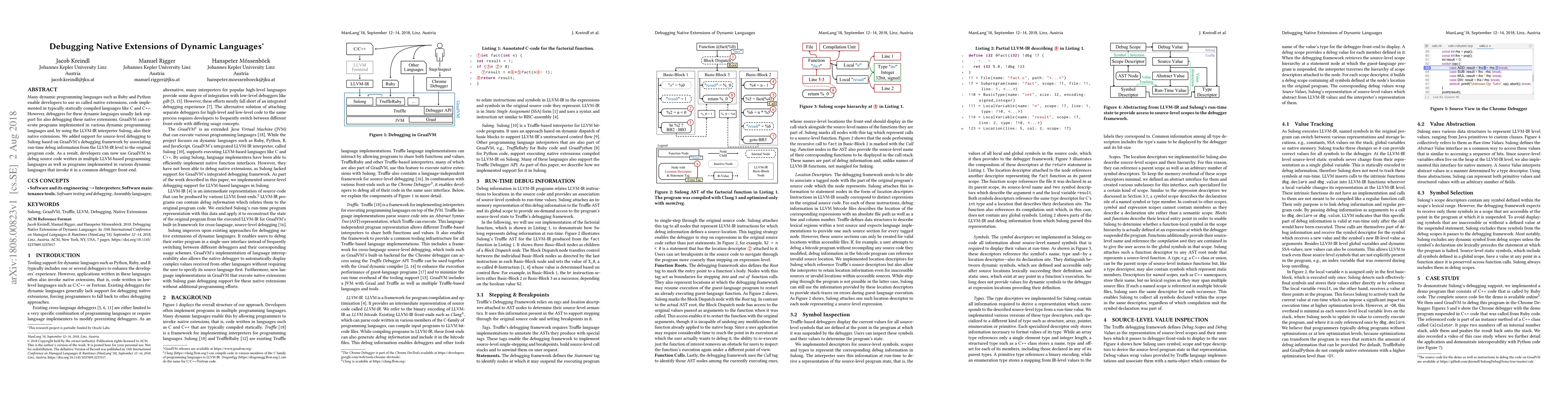 The research implemented source-level debugging support in Sulong, a Truffle-based interpreter for LLVM-IR, enabling debugging of dynamic programming languages and their native extensions in the same debugger front-end.