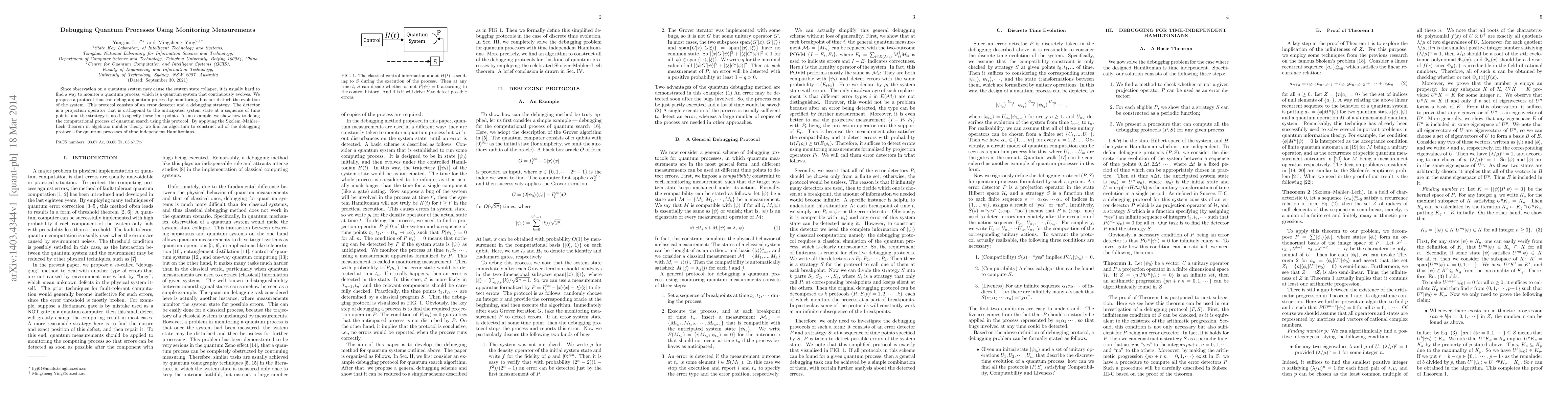 Since observation on a quantum system may cause the system state collapse, it is usually hard to find a way to monitor a quantum process, which is a quantum system that continuously evolves. We propose a protocol that can debug a quantum process by monitoring, but not disturb the evolution of the system. This protocol consists of an error detector and a debugging strategy. The detector is a projection operator that is orthogonal to the anticipated system state at a sequence of time points, and the strategy is used to specify these time points. As an example, we show how to debug the computational process of quantum search using this protocol. By applying the Skolem--Mahler--Lech theorem in algebraic number theory, we find an algorithm to construct all of the debugging protocols for quantum processes of time independent Hamiltonians.