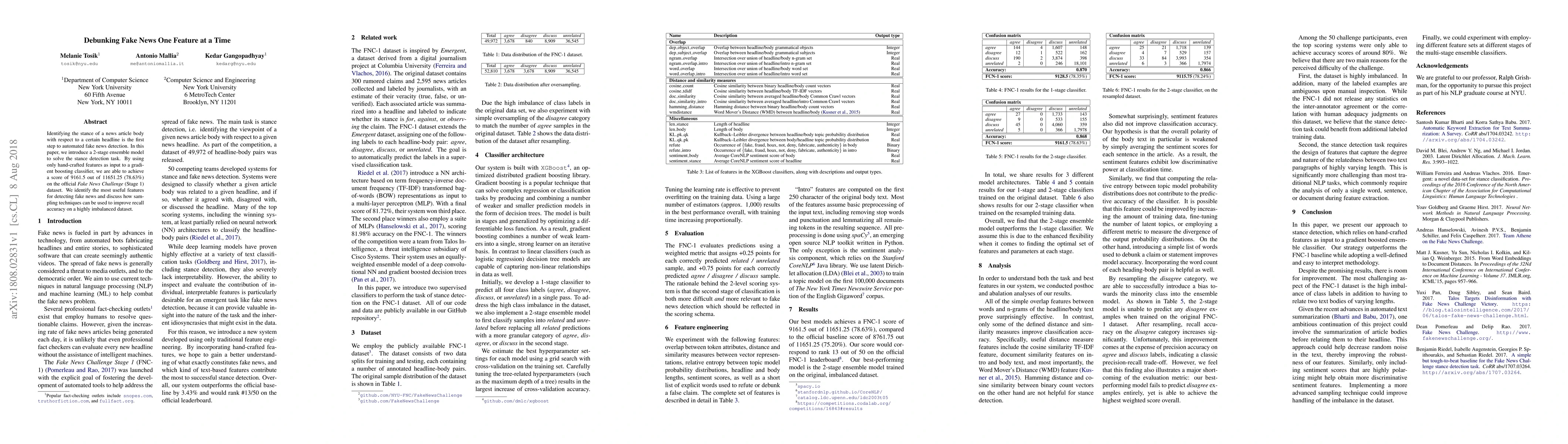 Identifying the stance of a news article body with respect to a certain headline is the first step to automated fake news detection. In this paper, we introduce a 2-stage ensemble model to solve the stance detection task. By using only hand-crafted features as input to a gradient boosting classifier, we are able to achieve a score of 9161.5 out of 11651.25 (78.63%) on the official Fake News Challenge (Stage 1) dataset. We identify the most useful features for detecting fake news and discuss how sampling techniques can be used to improve recall accuracy on a highly imbalanced dataset.
