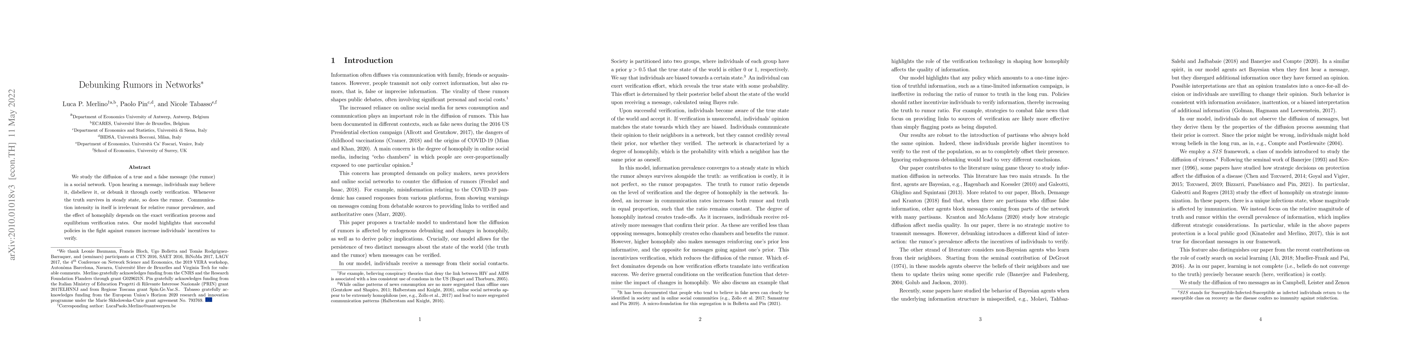 This study shows that in a social network, true and false messages (rumors) can spread equally if individuals verify the truth of information; successful policies against rumors increase verification incentives.