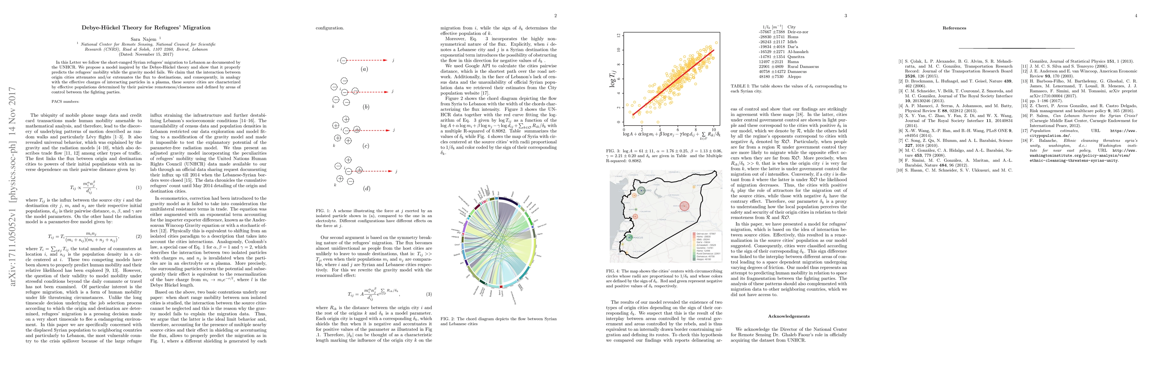 In this Letter we follow the short-ranged Syrian refugees' migration to Lebanon as documented by the UNHCR. We propose a model inspired by the Debye-H\"{u}ckel theory and show that it properly predicts the refugees' mobility while the gravity model fails. We claim that the interaction between origin cities attenuates and/or extenuates the flux to destinations, and consequently, in analogy with the effective charges of interacting particles in a plasma, these source cities are characterized by effective populations determined by their pairwise remoteness/closeness and defined by areas of control between the fighting parties.