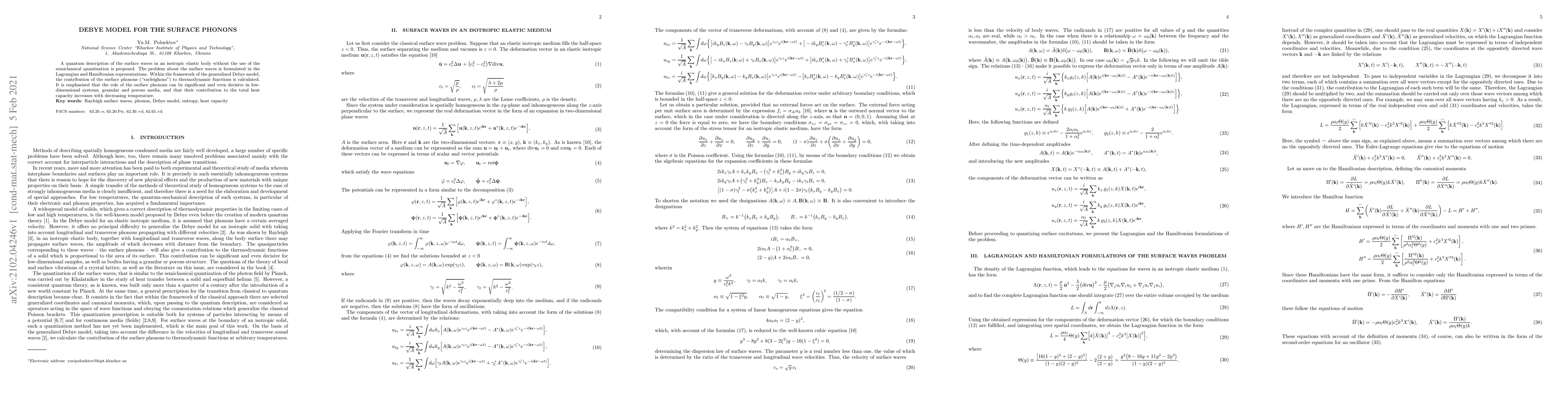 This research introduces a quantum description for surface waves in elastic bodies, using the Debye model, without semiclassical quantization. It highlights the significant role of surface phonons, or rayleighons, in low-dimensional systems, granular and porous media, with their contribution to heat capacity increasing at lower temperatures.