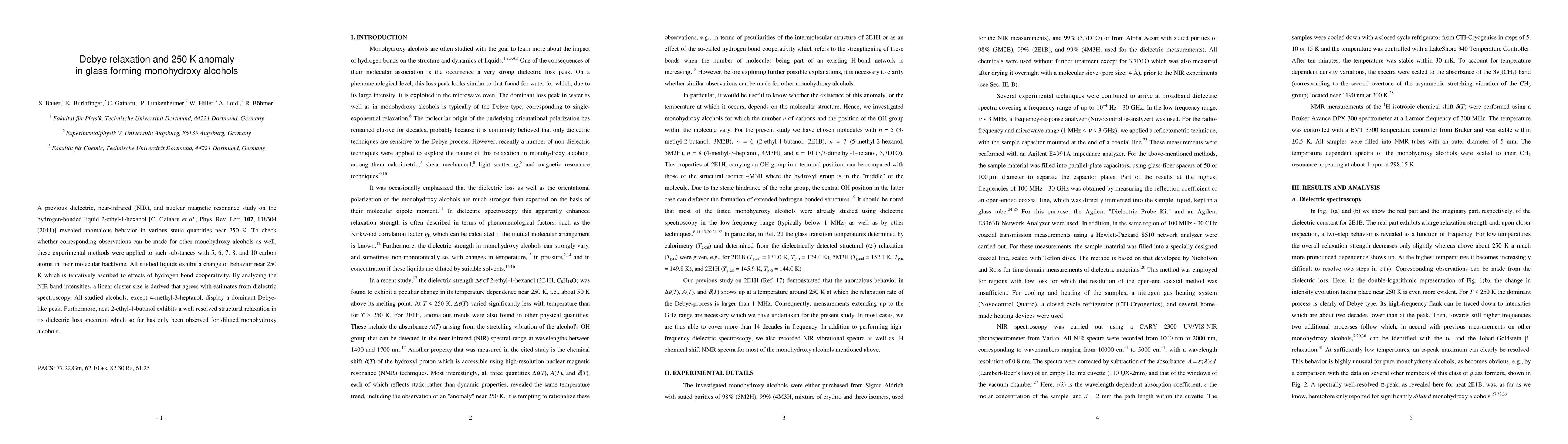 Researchers studied 5 monohydroxy alcohols with varying molecular backbones for changes in behavior near 250 K, finding a Debye-like peak and structural relaxation in some samples, attributed to hydrogen bond cooperativity.