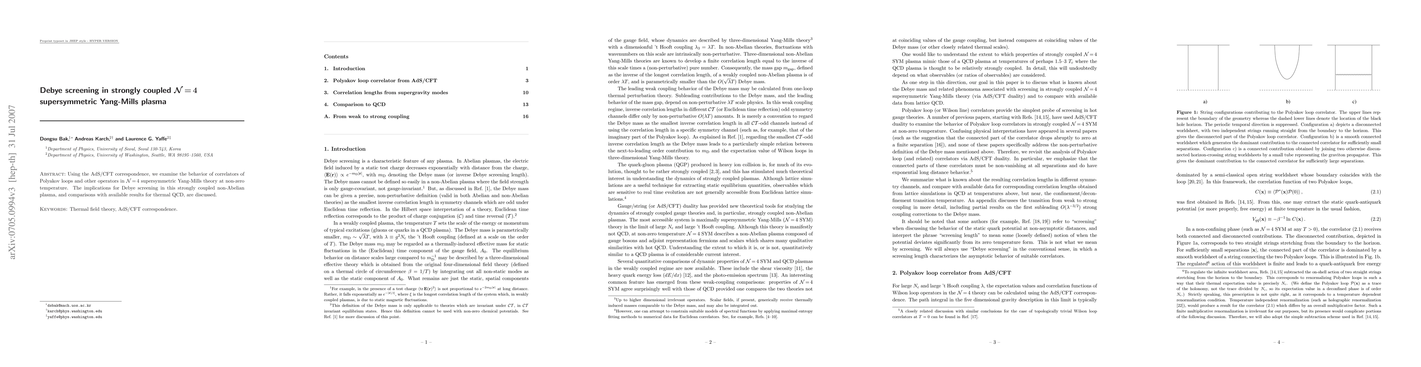 This study uses the AdS/CFT correspondence to analyze correlators in N=4 supersymmetric Yang-Mills theory at non-zero temperature, focusing on the implications for Debye screening in strongly coupled non-Abelian plasmas and comparing these findings with thermal QCD results.