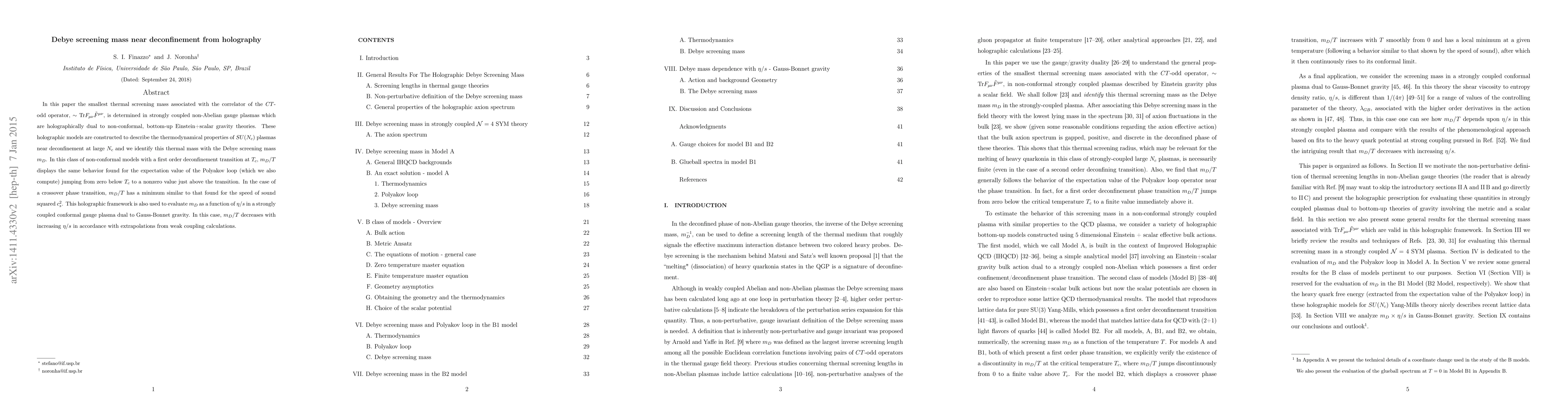 In this paper the smallest thermal screening mass associated with the correlator of the $CT$-odd operator, $\sim {\rm Tr}F_{\mu\nu}\tilde{F}^{\mu\nu}$, is determined in strongly coupled non-Abelian gauge plasmas which are holographically dual to non-conformal, bottom-up Einstein+scalar gravity theories. These holographic models are constructed to describe the thermodynamical properties of $SU(N_c)$ plasmas near deconfinement at large $N_c$ and we identify this thermal mass with the Debye screening mass $m_D$. In this class of non-conformal models with a first order deconfinement transition at $T_c$, $m_D/T$ displays the same behavior found for the expectation value of the Polyakov loop (which we also compute) jumping from zero below $T_c$ to a nonzero value just above the transition. In the case of a crossover phase transition, $m_D/T$ has a minimum similar to that found for the speed of sound squared $c_s^2$. This holographic framework is also used to evaluate $m_D$ as a function of $\eta/s$ in a strongly coupled conformal gauge plasma dual to Gauss-Bonnet gravity. In this case, $m_D/T$ decreases with increasing $\eta/s$ in accordance with extrapolations from weak coupling calculations.