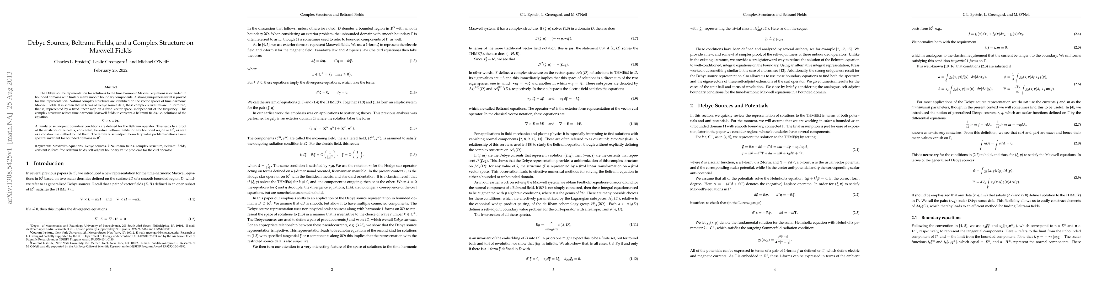 The Debye source representation for solutions to the time harmonic Maxwell equations is extended to bounded domains with finitely many smooth boundary components. A strong uniqueness result is proved for this representation. Natural complex structures are identified on the vector spaces of time-harmonic Maxwell fields. It is shown that in terms of Debye source data, these complex structures are uniformized, that is, represented by a fixed linear map on a fixed vector space, independent of the frequency. This complex structure relates time-harmonic Maxwell fields to constant-k Beltrami fields, i.e. solutions of the equation curl(E) = kE. A family of self-adjoint boundary conditions are defined for the Beltrami operator. This leads to a proof of the existence of zero-flux, constant-k, force-free Beltrami fields for any bounded region in R^3, as well as a constructive method to find them. The family of self-adjoint boundary value problems defines a new spectral invariant for bounded domains in R^3.