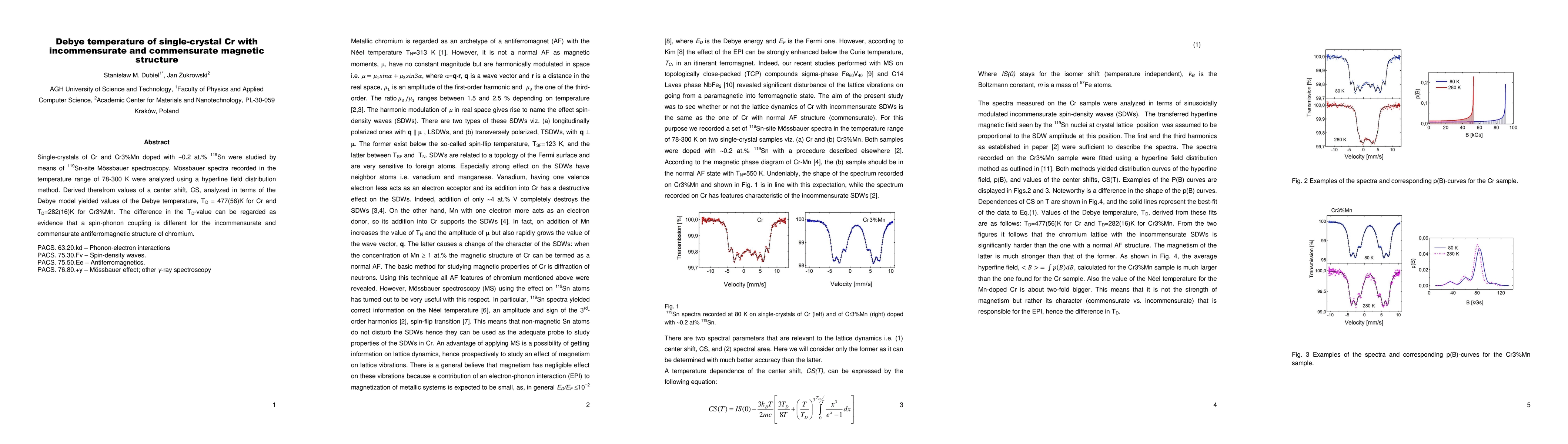 Researchers studied chromium single-crystals with incommensurate and commensurate magnetic structures using Mossbauer spectroscopy, finding different Debye temperatures of 477K for Cr and 282K for Cr3%Mn, suggesting a difference in spin-phonon interactions.