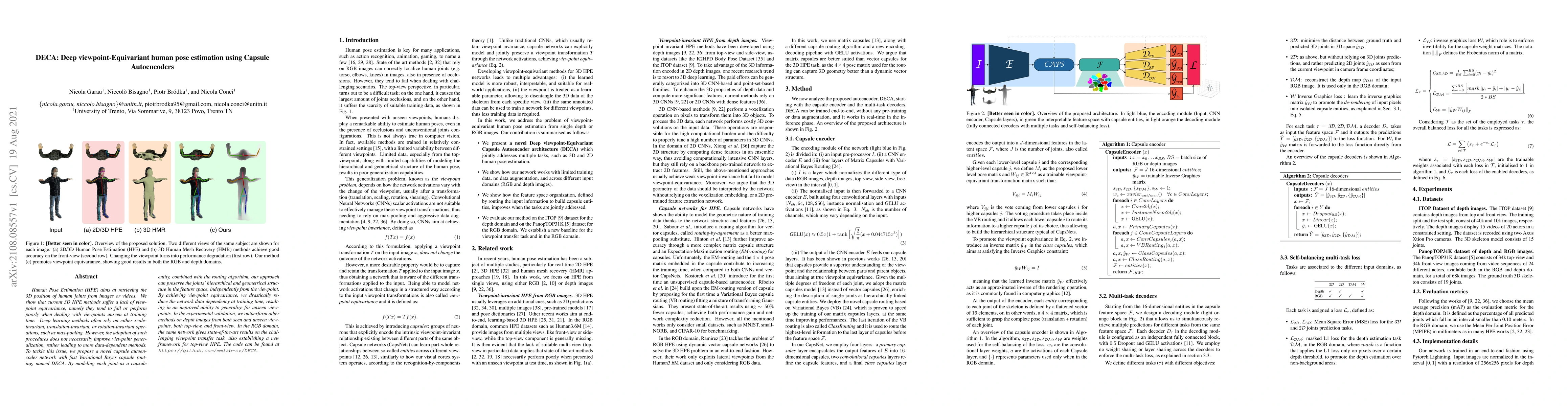 The paper proposes DECA, a novel capsule autoencoder network with Variational Bayes capsule routing to achieve viewpoint-equivariance in 3D human pose estimation, significantly improving generalization to unseen viewpoints. Experimental results show superior performance on depth and RGB images across various viewpoints.