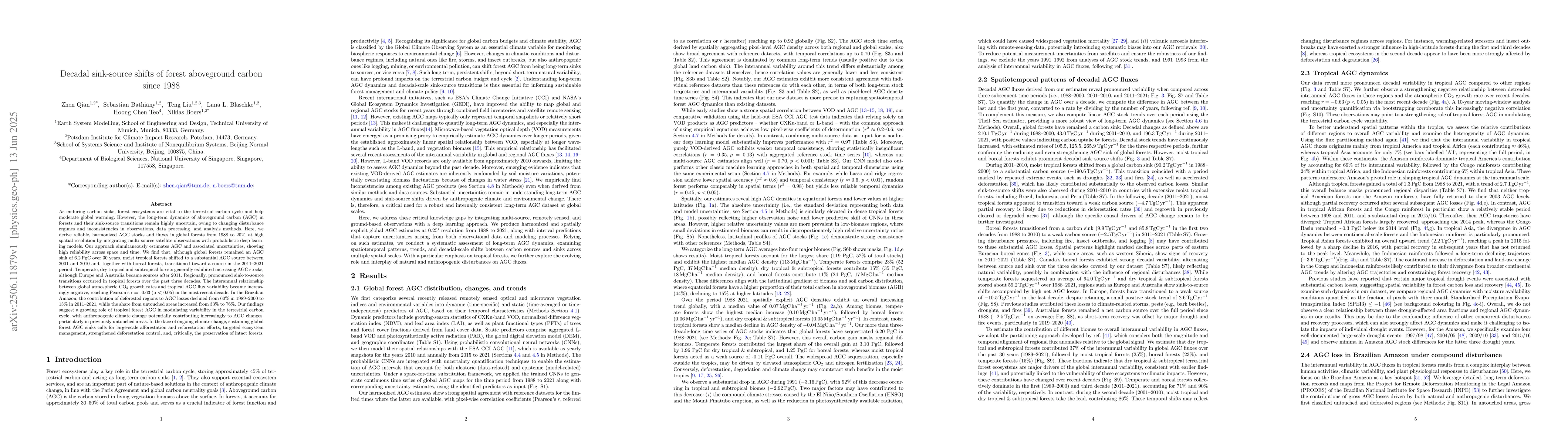 As enduring carbon sinks, forest ecosystems are vital to the terrestrial carbon cycle and help moderate global warming. However, the long-term dynamics of aboveground carbon (AGC) in forests and their sink-source transitions remain highly uncertain, owing to changing disturbance regimes and inconsistencies in observations, data processing, and analysis methods. Here, we derive reliable, harmonized AGC stocks and fluxes in global forests from 1988 to 2021 at high spatial resolution by integrating multi-source satellite observations with probabilistic deep learning models. Our approach simultaneously estimates AGC and associated uncertainties, showing high reliability across space and time. We find that, although global forests remained an AGC sink of 6.2 PgC over 30 years, moist tropical forests shifted to a substantial AGC source between 2001 and 2010 and, together with boreal forests, transitioned toward a source in the 2011-2021 period. Temperate, dry tropical and subtropical forests generally exhibited increasing AGC stocks, although Europe and Australia became sources after 2011. Regionally, pronounced sink-to-source transitions occurred in tropical forests over the past three decades. The interannual relationship between global atmospheric CO2 growth rates and tropical AGC flux variability became increasingly negative, reaching Pearson's r = -0.63 (p < 0.05) in the most recent decade. In the Brazilian Amazon, the contribution of deforested regions to AGC losses declined from 60% in 1989-2000 to 13% in 2011-2021, while the share from untouched areas increased from 33% to 76%. Our findings suggest a growing role of tropical forest AGC in modulating variability in the terrestrial carbon cycle, with anthropogenic climate change potentially contributing increasingly to AGC changes, particularly in previously untouched areas.