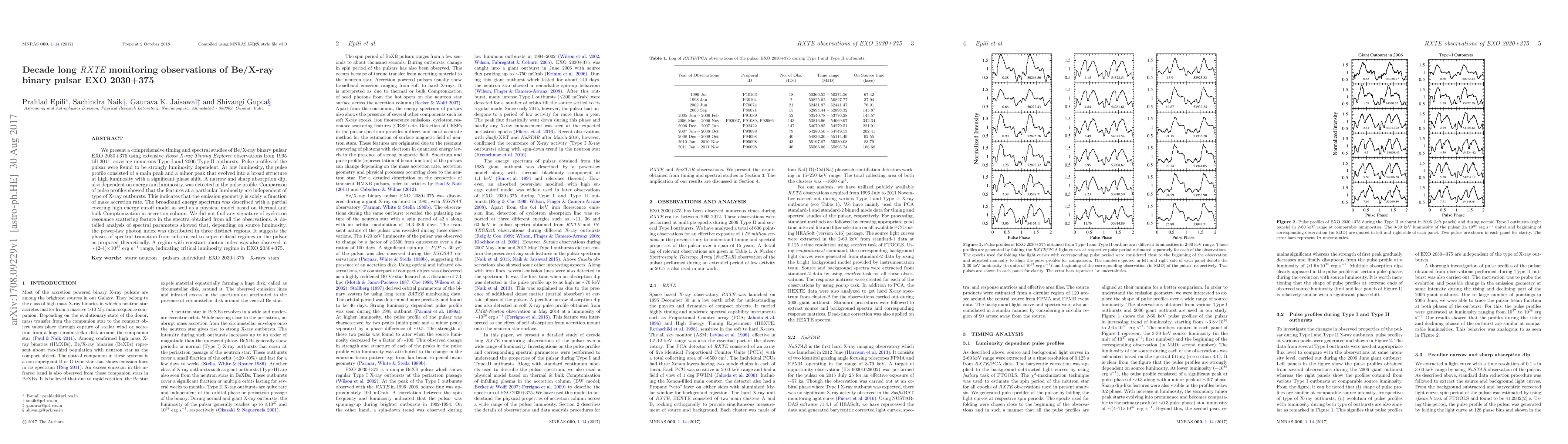 This study presents extensive RXTE observations of the Be/X-ray binary pulsar EXO 2030+375 from 1995 to 2011, revealing luminosity-dependent pulse profiles and spectral transitions. The pulse profiles evolve from a main peak to a broad structure with a phase shift, indicating emission geometry dependent on mass accretion rate.